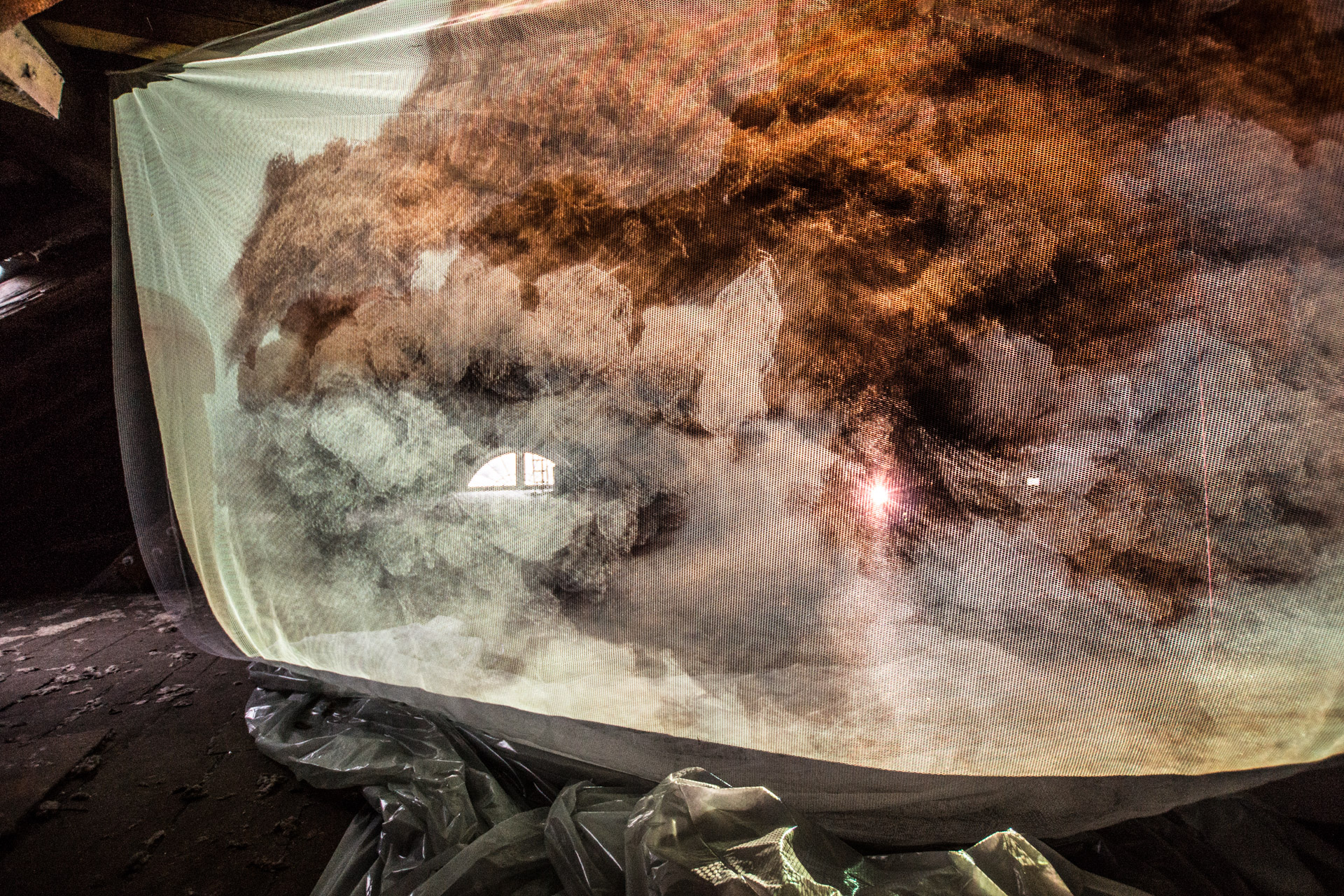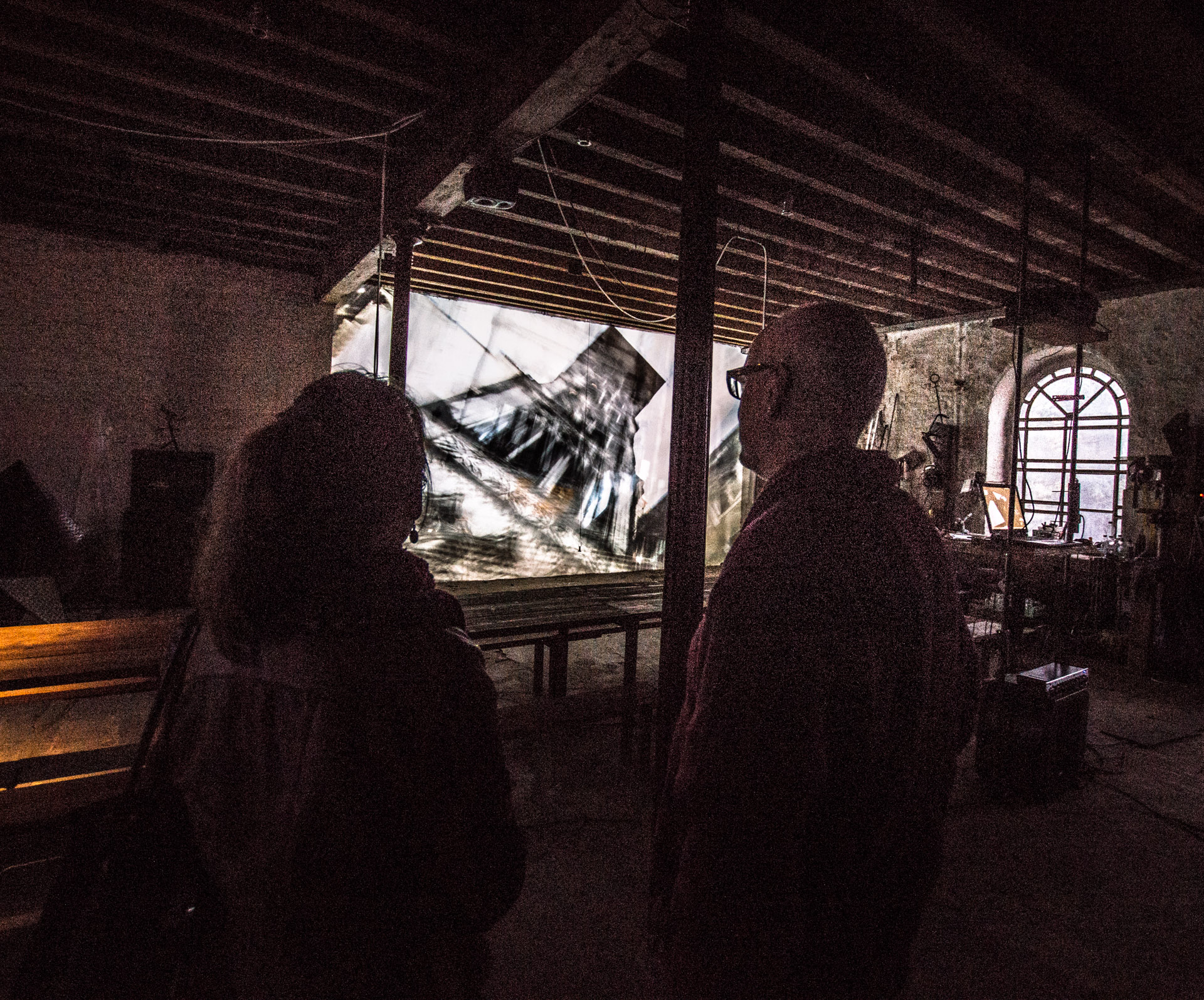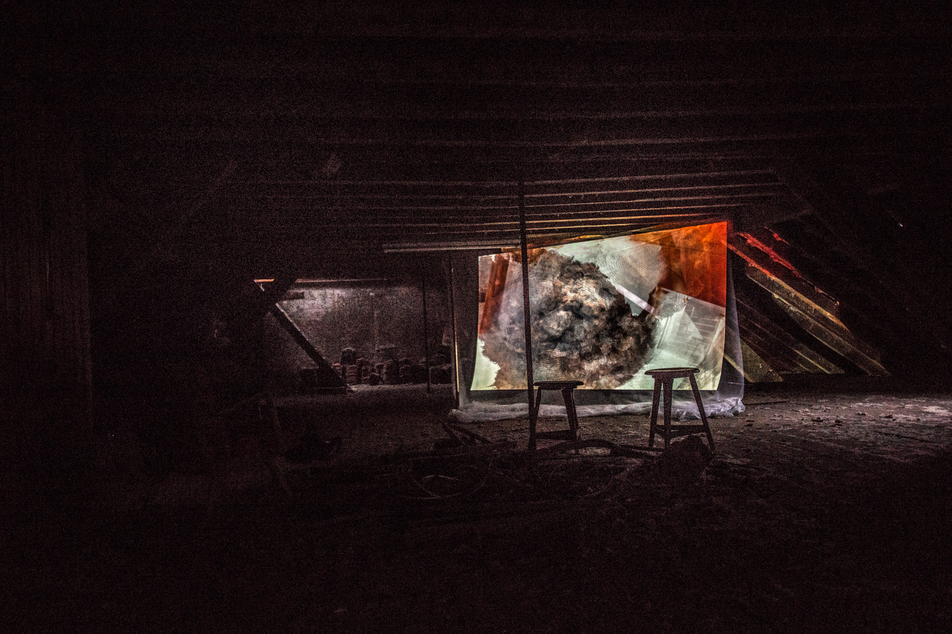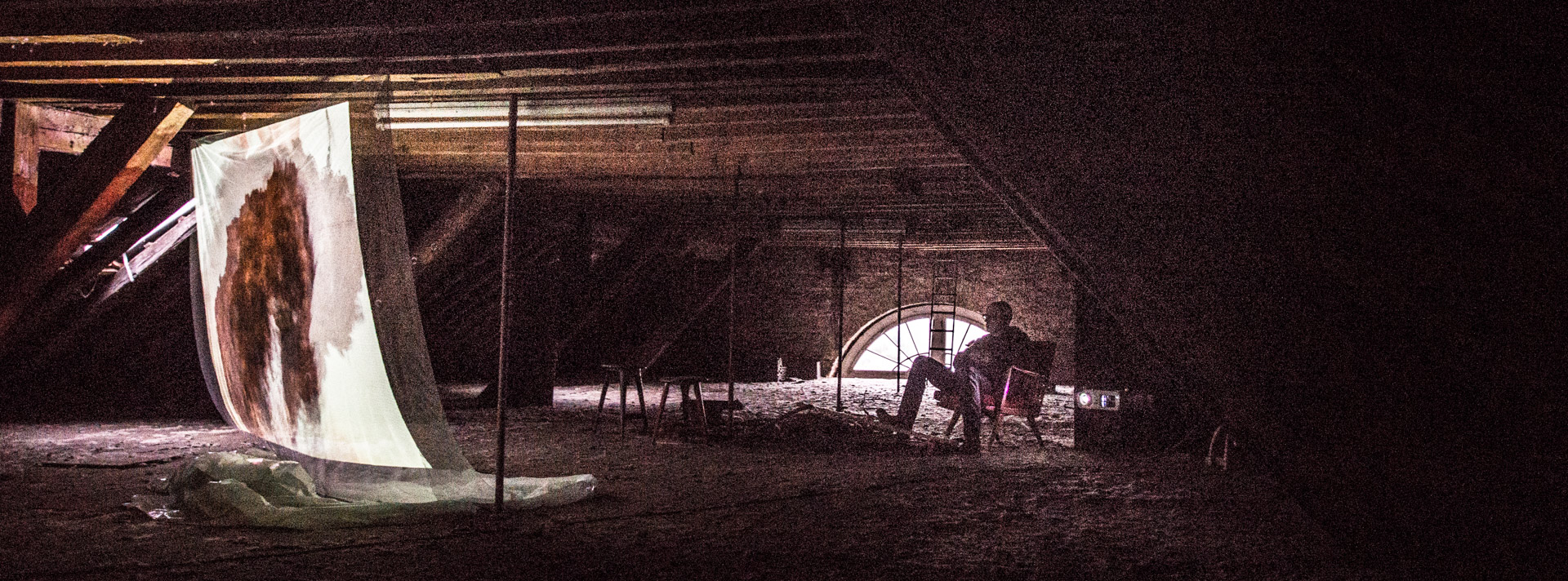 »Belmonte« schließlich erfüllte das Dachgeschoss der Mühle. Spooky, wie es der Lokalreporter beschrieb, war die Projektion auf eine Gaze-Leinwand in der Mitte des Raums, mit nicht zu lokalisierenden Klangquellen. Zu sehen waen Bilder über eine Arbeit der portugiesischen Künstlerin Pia Maria de Oliveira, wiederum mit einer Klangkomposition von Ronald Gaube.
