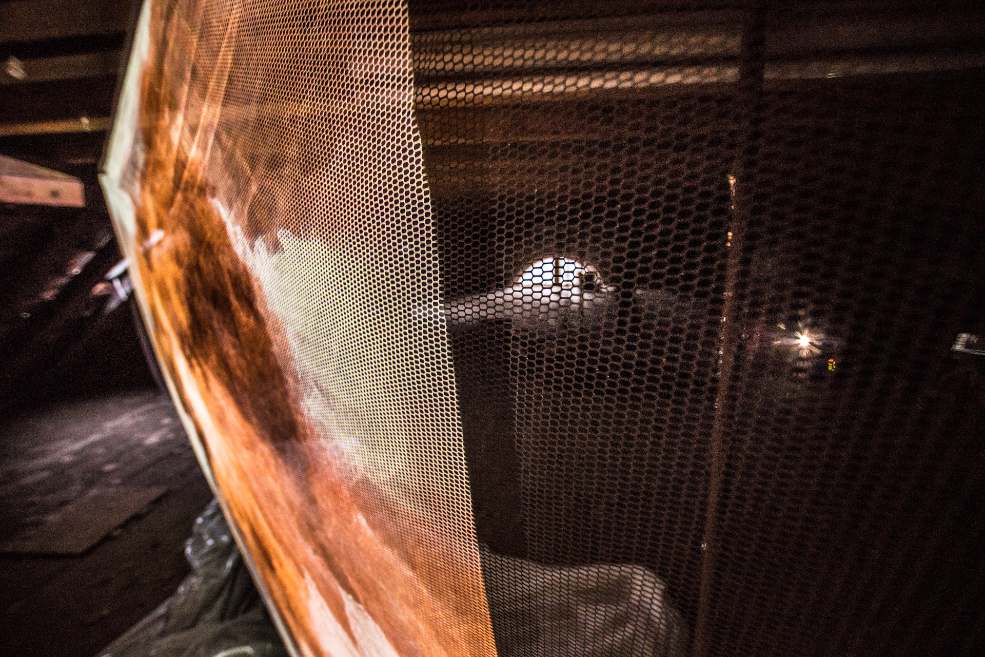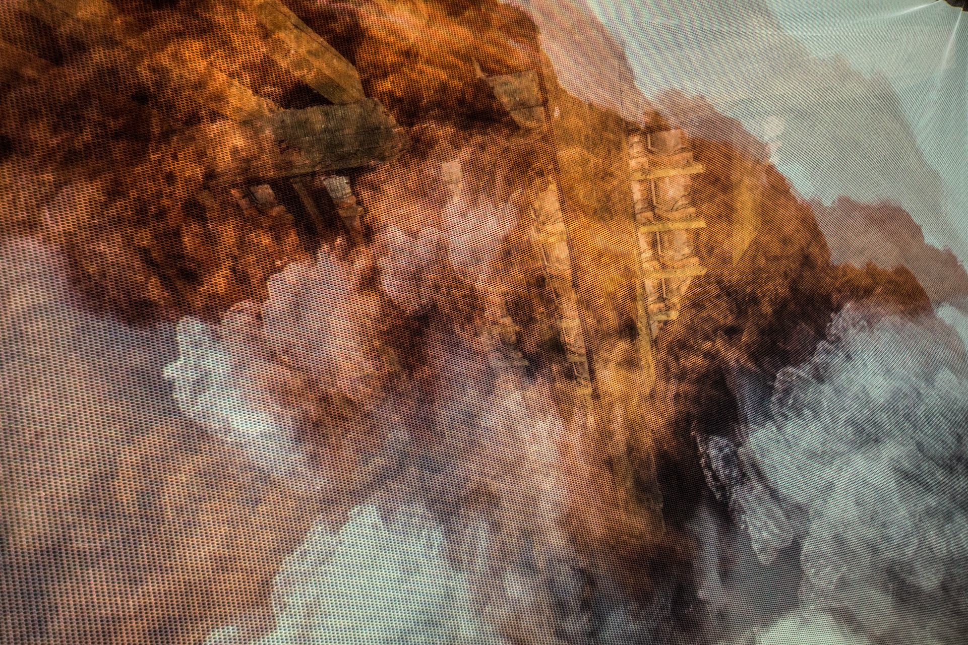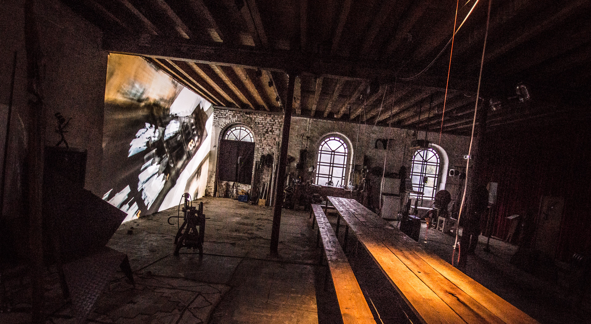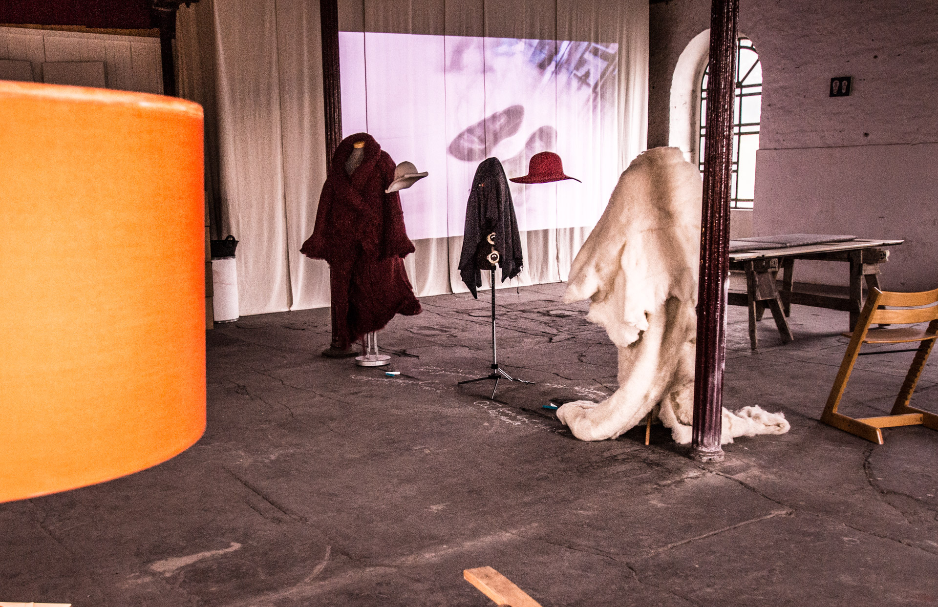 »Belmonte« schließlich erfüllte das Dachgeschoss der Mühle. Spooky, wie es der Lokalreporter beschrieb, war die Projektion auf eine Gaze-Leinwand in der Mitte des Raums, mit nicht zu lokalisierenden Klangquellen. Zu sehen waen Bilder über eine Arbeit der portugiesischen Künstlerin Pia Maria de Oliveira, wiederum mit einer Klangkomposition von Ronald Gaube.