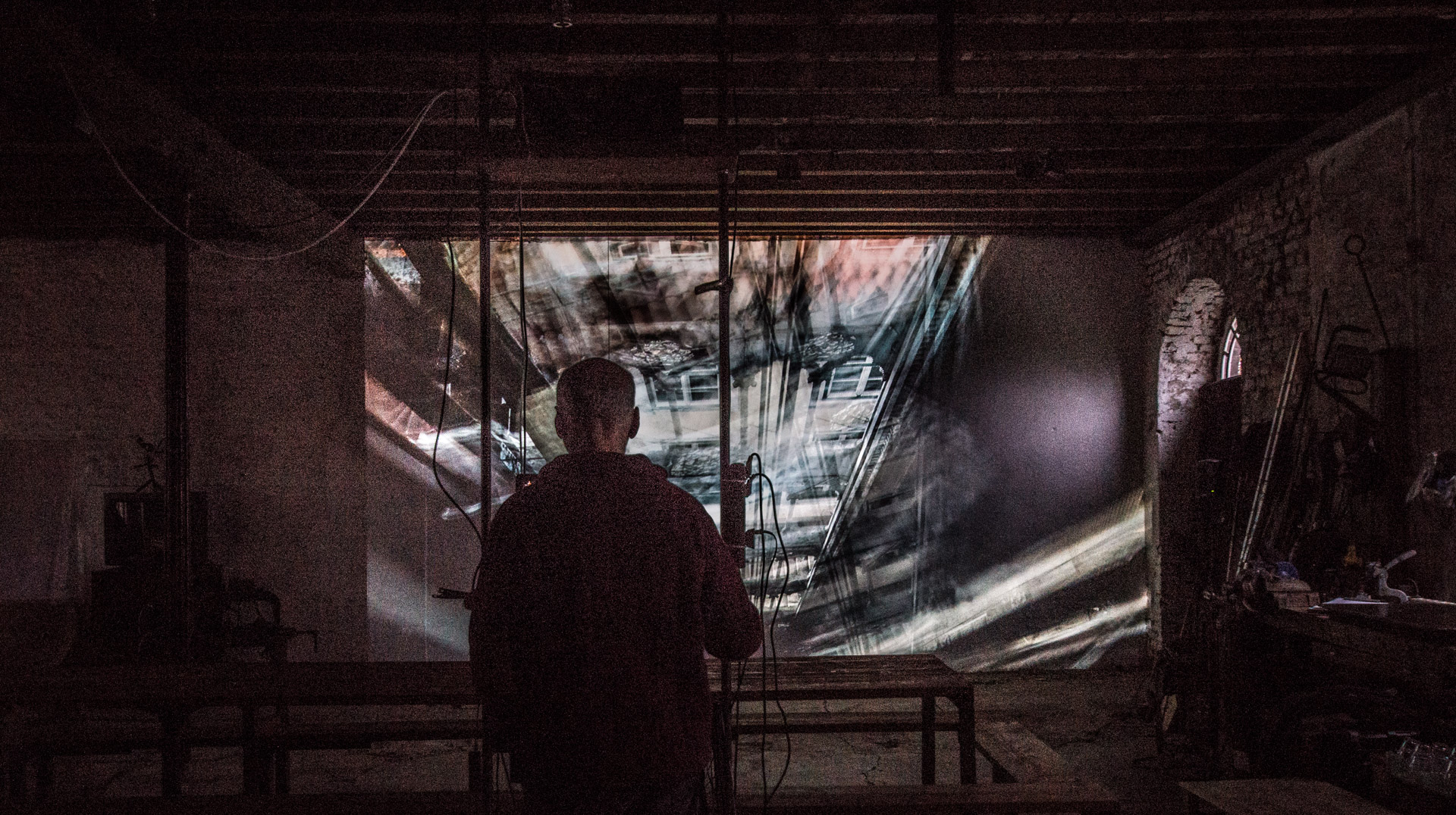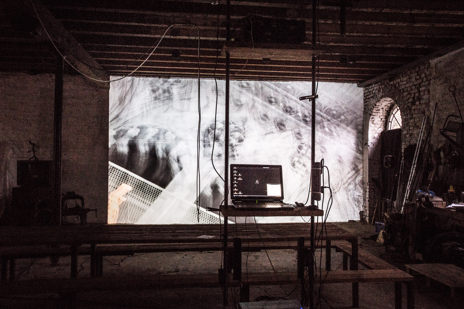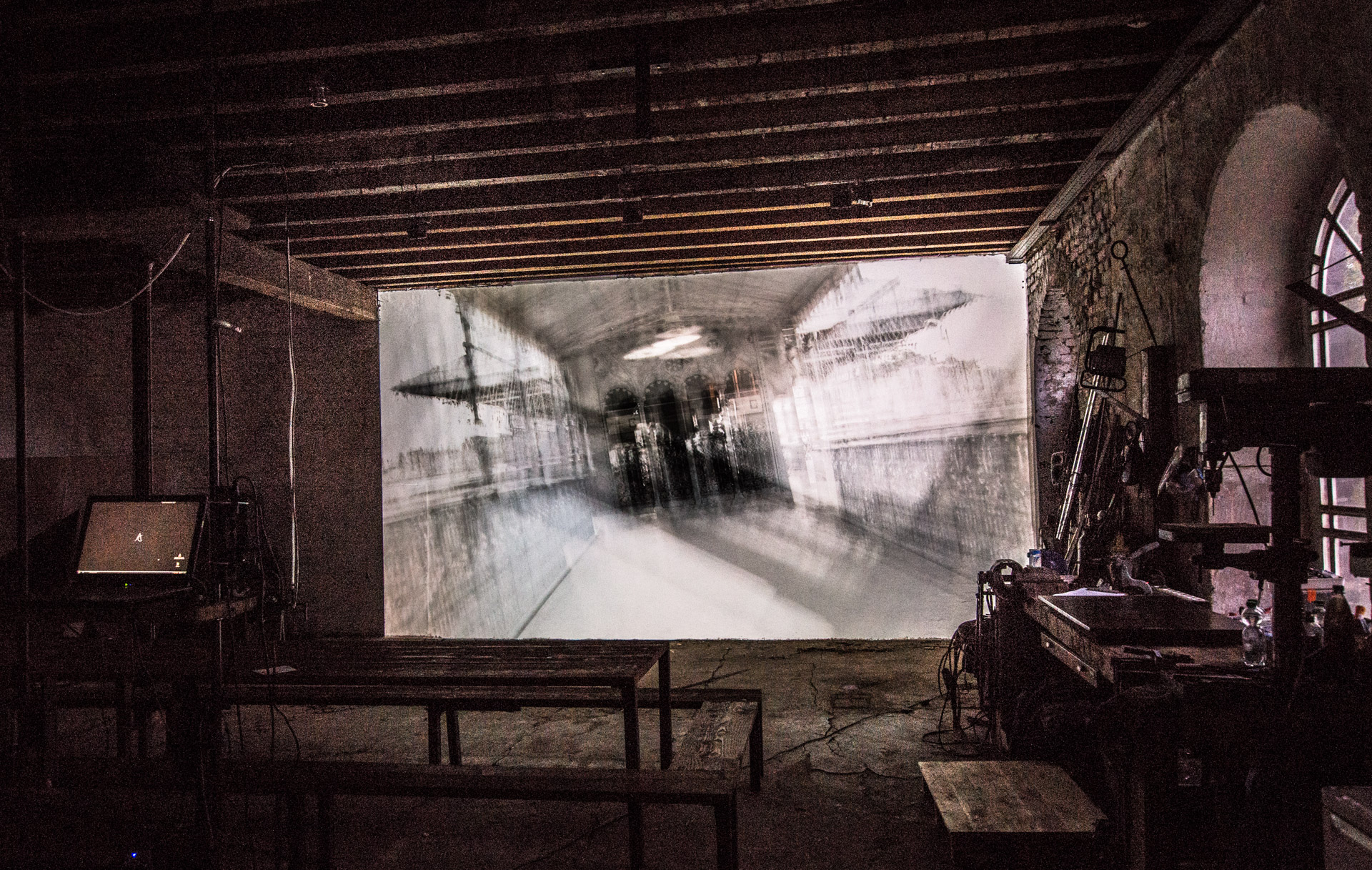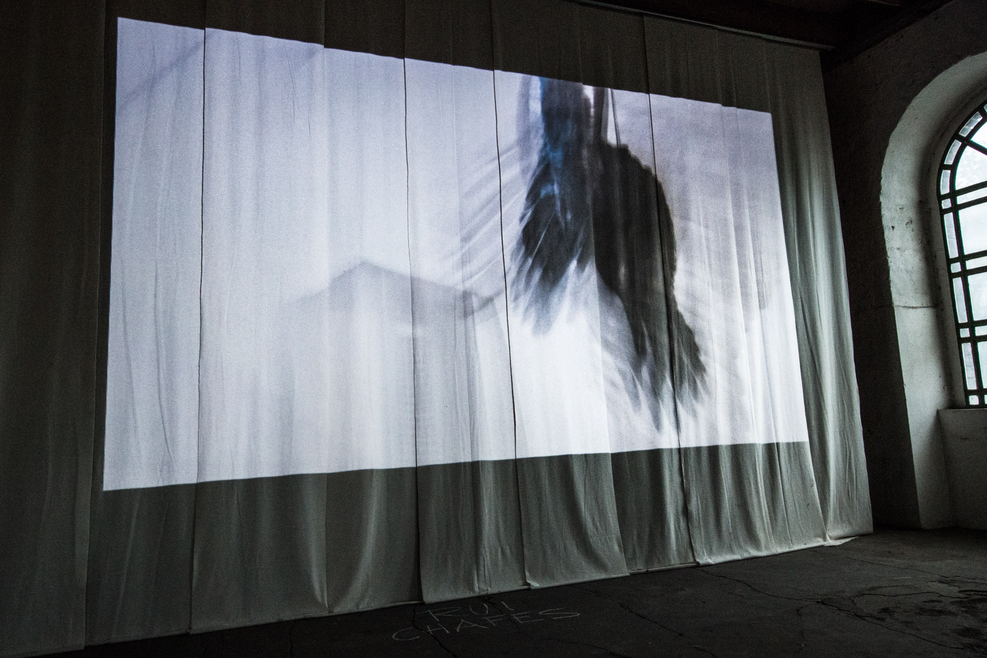 »Visiting Rui Chafes« haben wir auf einen Vorhang in Elisa Solas Atelier projiziert. Die angrenzenden Räume ließen die beiden Sound-Installationen ineinander übergehen, ähnlich wie die Bilder der Liquid Images.