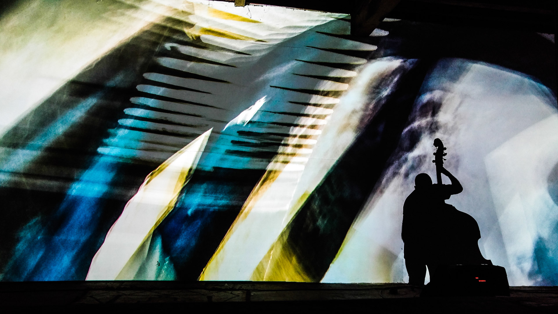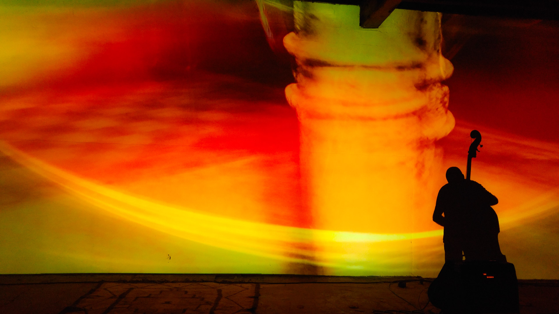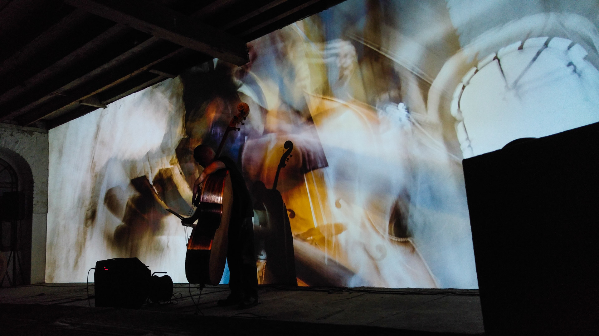 Eberhard Kranemann spielt Kontrabass und elektronische Musik zu Bildern von Peter Hölscher.