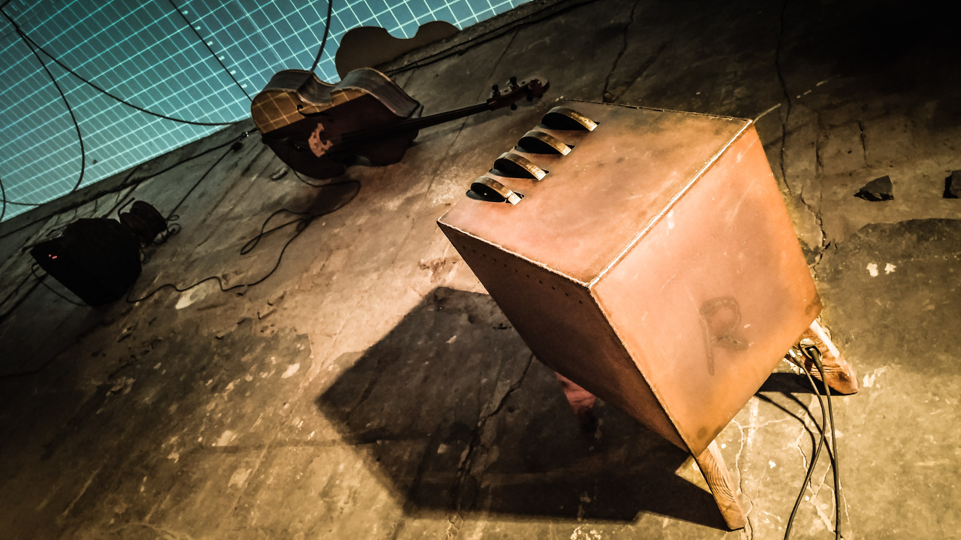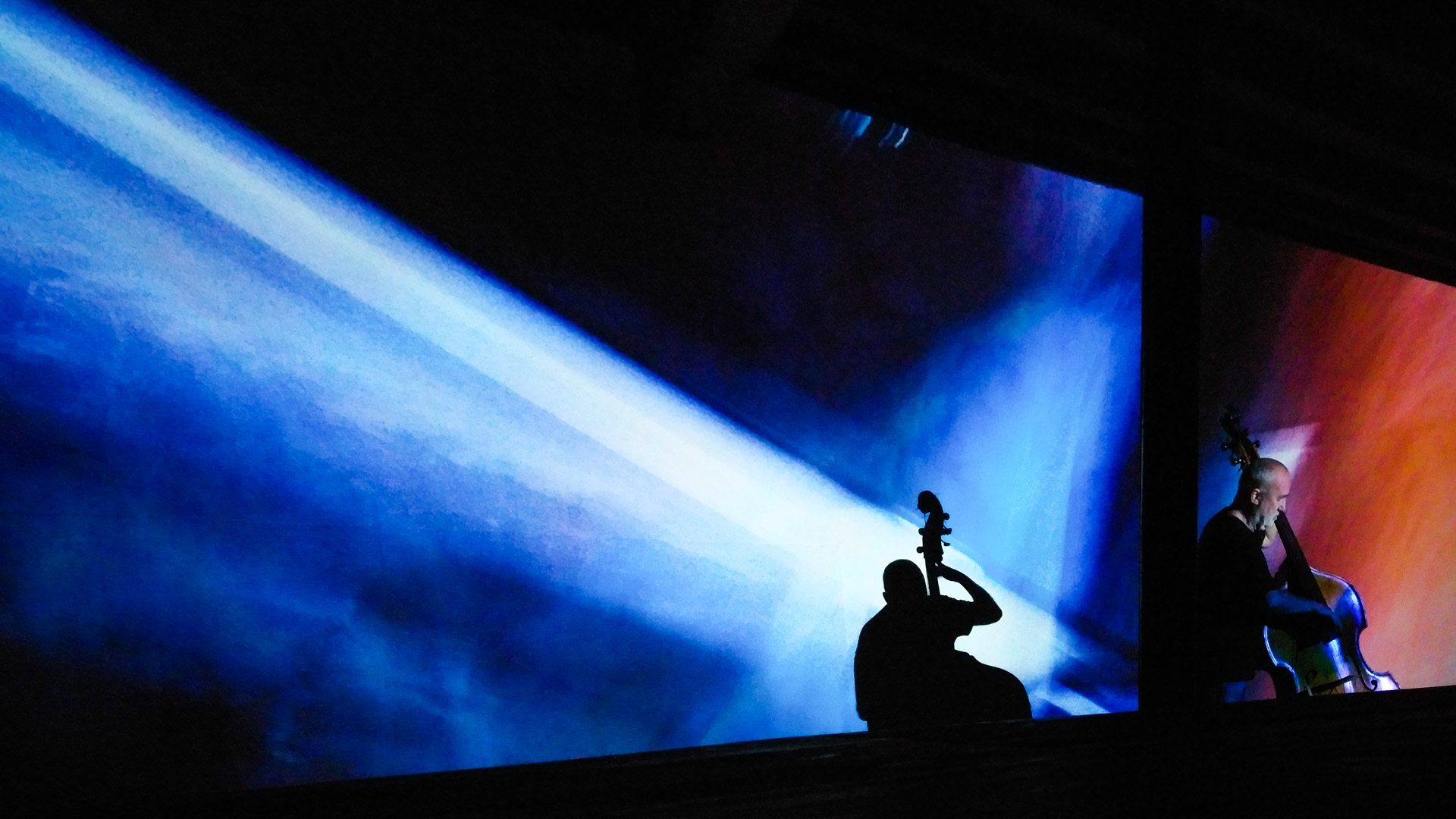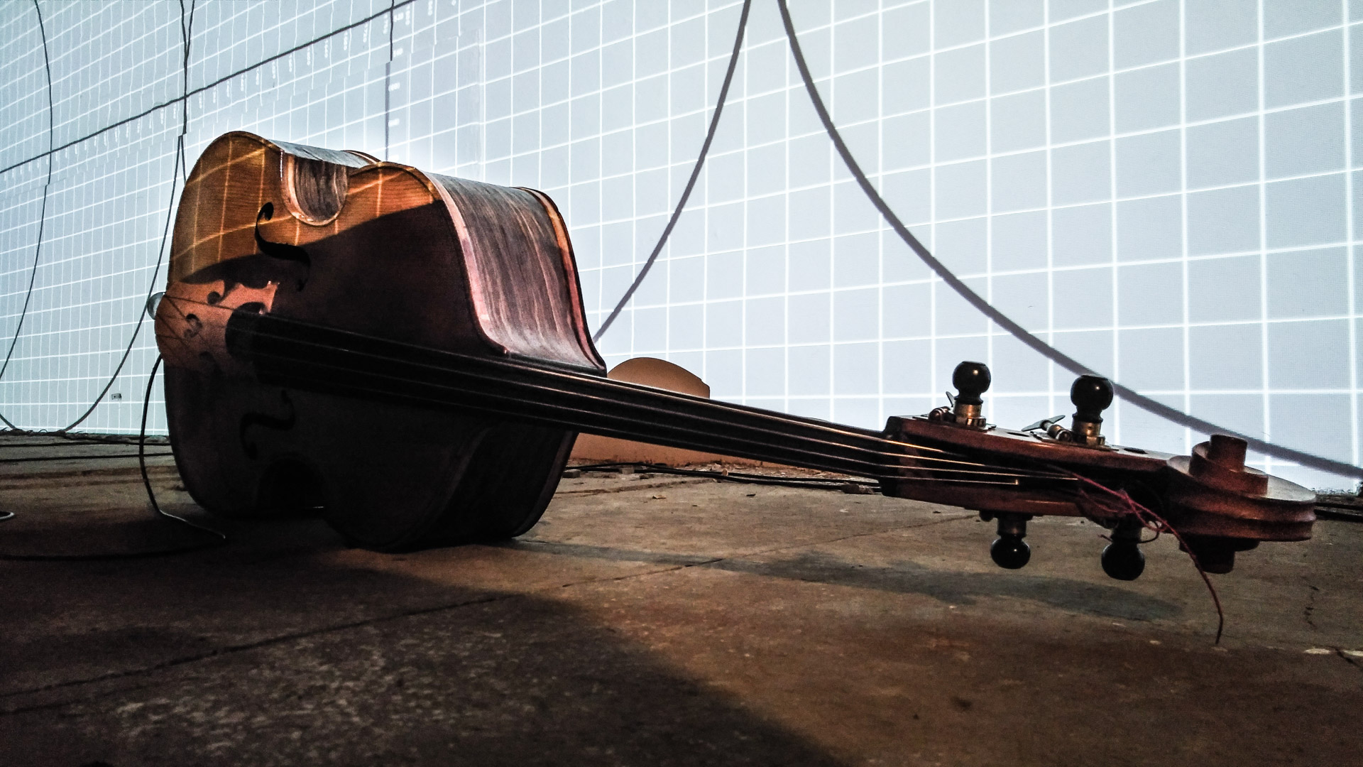 Eberhard Kranemann spielt Kontrabass und elektronische Musik zu Bildern von Peter Hölscher.