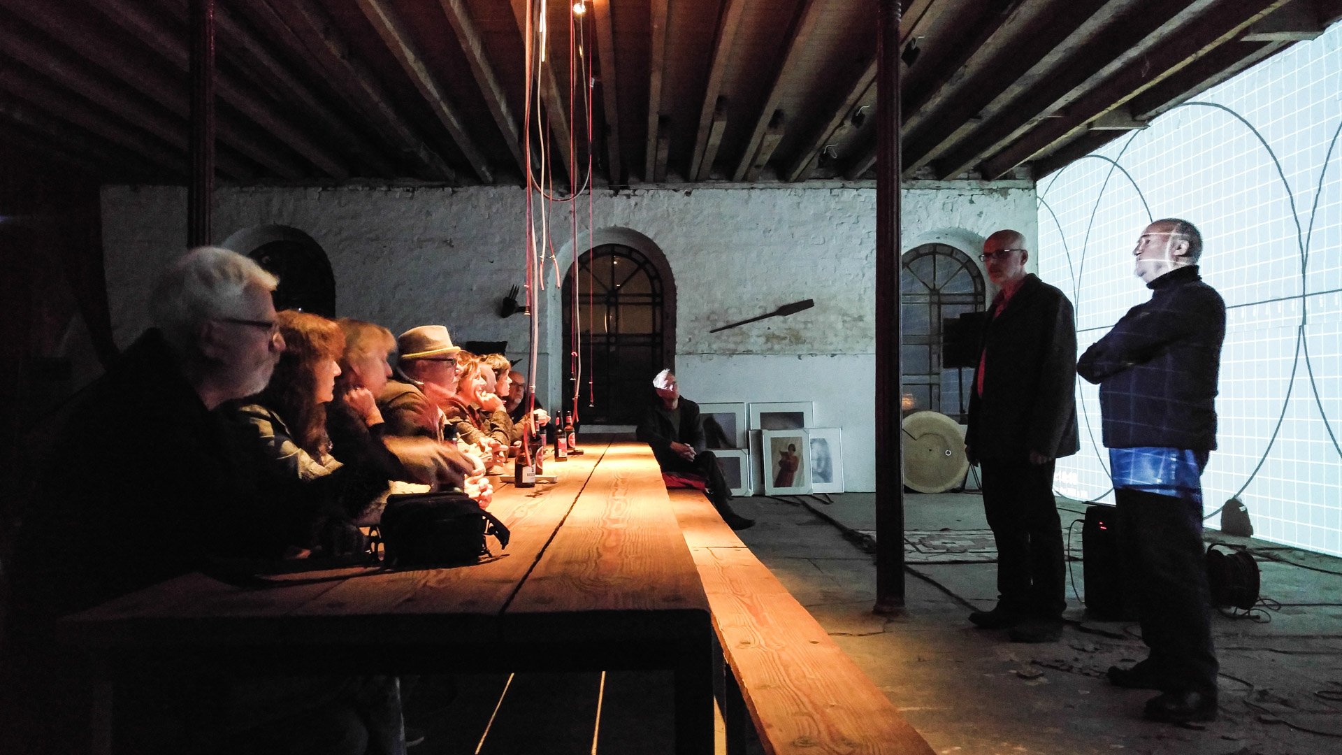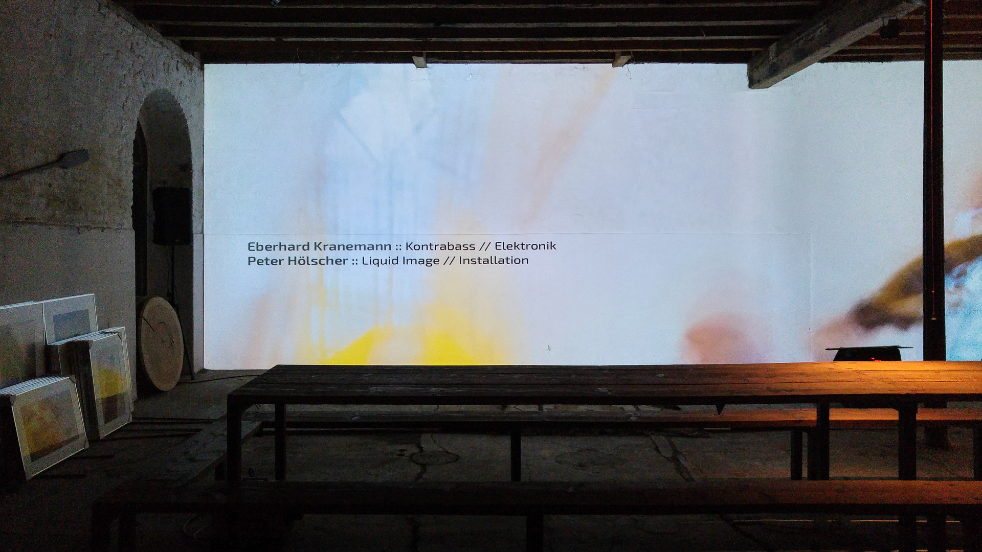 Im September 2015 hat Peter Hölscher Eberhard Kranemann in der Reuschenberger Mühle in seiner Liquid Images-Technik fotografiert. Der Ort – von 1847 bis heute als Kraftwerk genutzt – bietet spannende Foto-Locations, die teilweise nicht öffentlich zugänglich sind, z.B. der Generatorenraum, der Treibgut-Rechen, auch Hölschers Atelier. Kranemann spielte an diesen Orten seinen Kontrabass. Das Ergebnis dieser Session ist ein einstündiges Liquid Image, das in Großflächenprojektion gezeigt wurde und zu dem Kranemann wieder seinen Bass plus elektronischer Musik spielte.