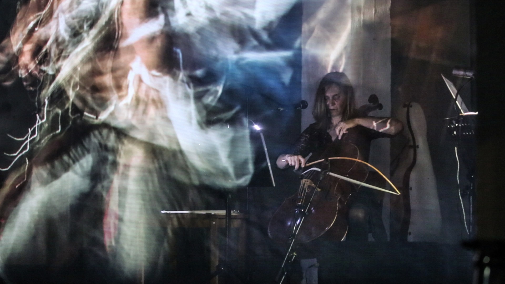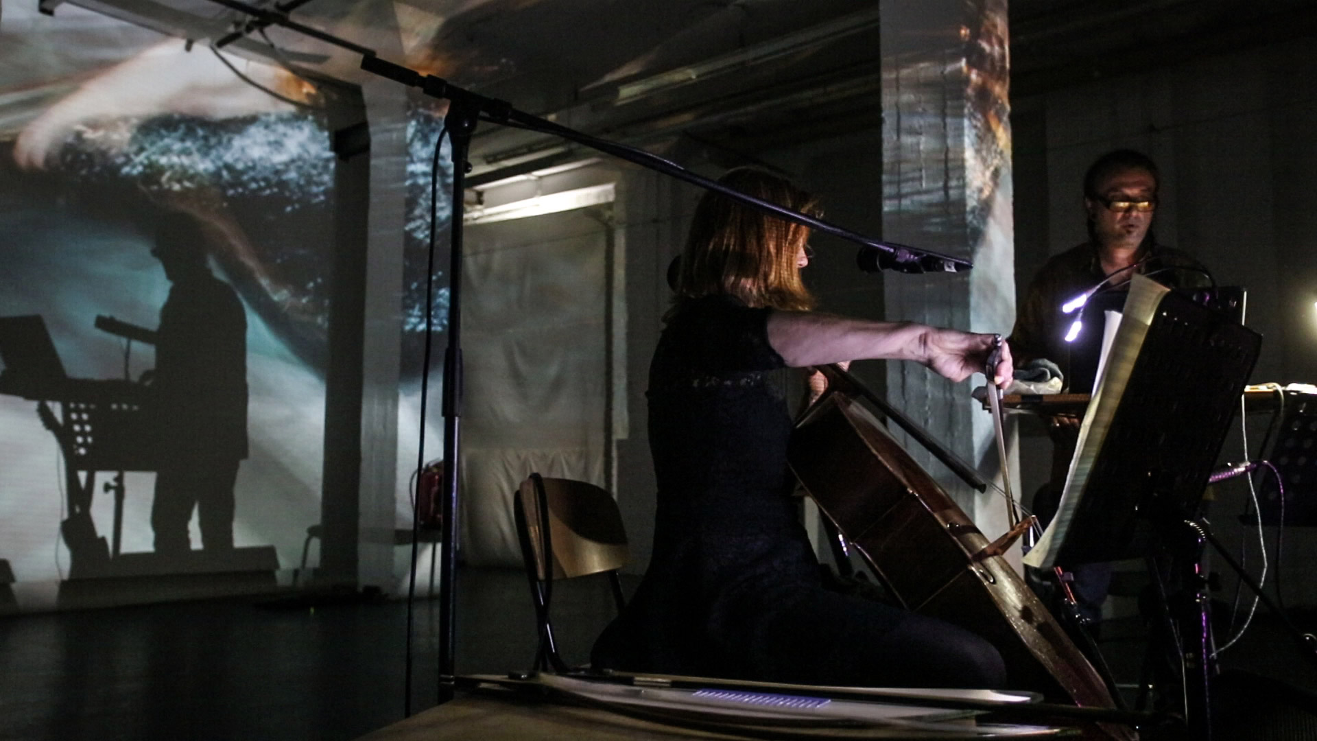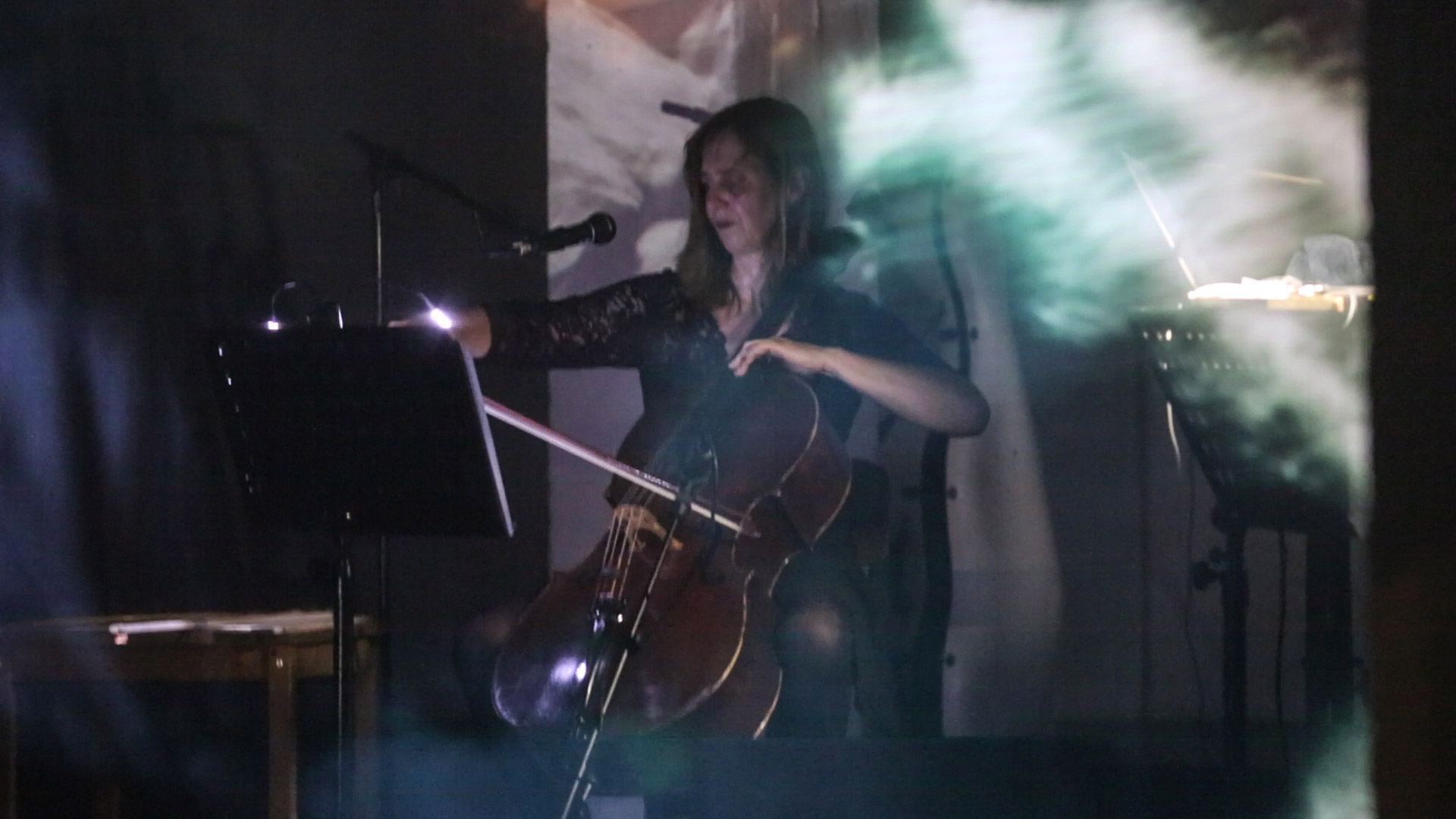 Konzert mit Marei Seuthe, Violoncello, Stimme und Singende Säge; Phil Reptil, Elektrogitarre und Elektrik; Peter Hölscher, Liquid Image »Gertrud«. Unser Part begann um 21.oo Uhr. Zuvor spielte nämlich noch Albrecht Maurer, Viola und Theo Jörgensmann, Klarinette, deren Sounds von Phil remixt wurden.