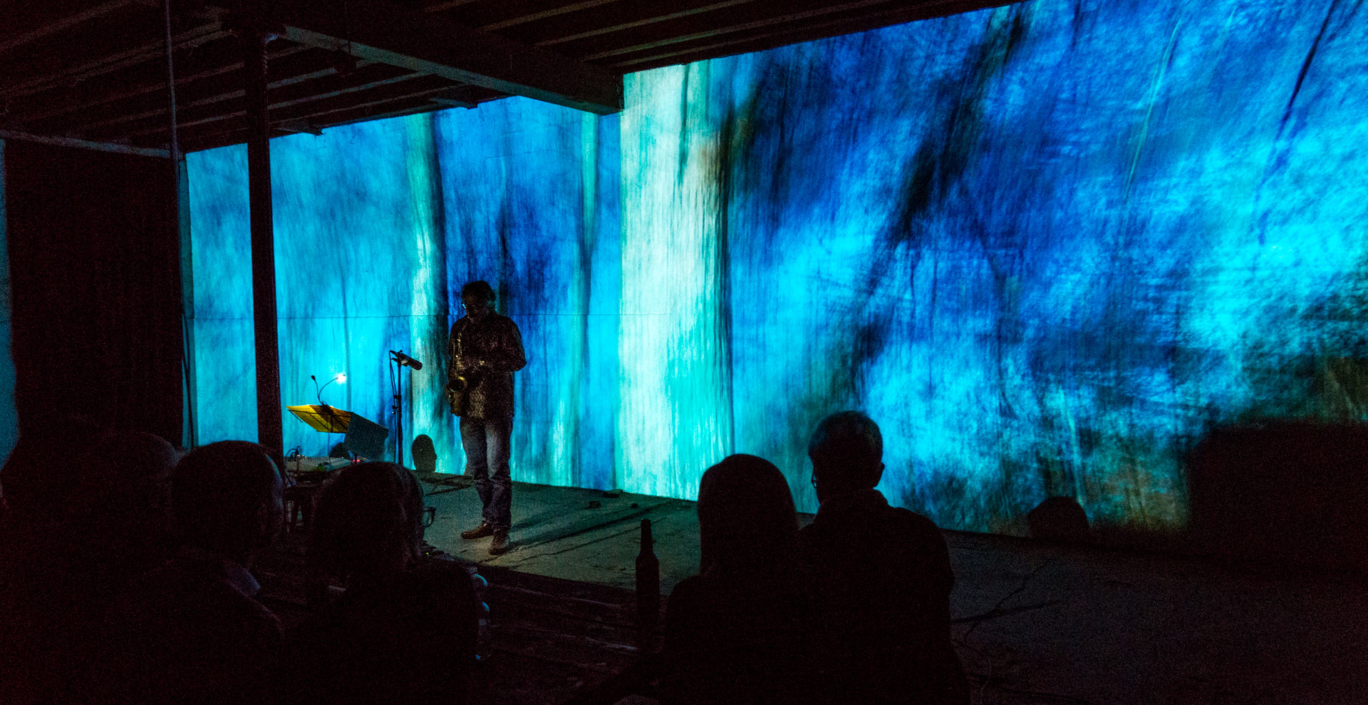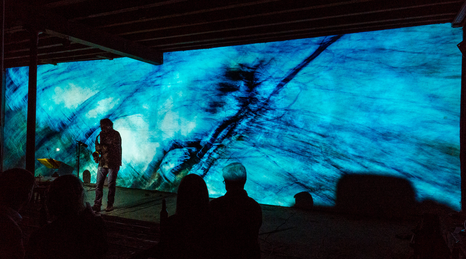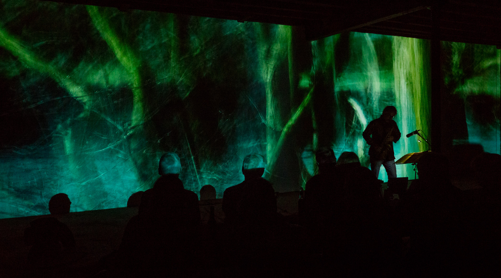Roger Hanschel spielte seine vierteilige Komposition für Saxofon und Elektronik zu Peter Hölschers vierteiligem Liquid Image »Deutscher Wald«, das formatfüllend auf die 12,5 Meter breite Rückwand seines Ateliers projiziert wurde. Es waren Kompositionen aus Bildern zu sehen, die Hölscher 2017 in deutschen Wäldern aufgenommen hatte.