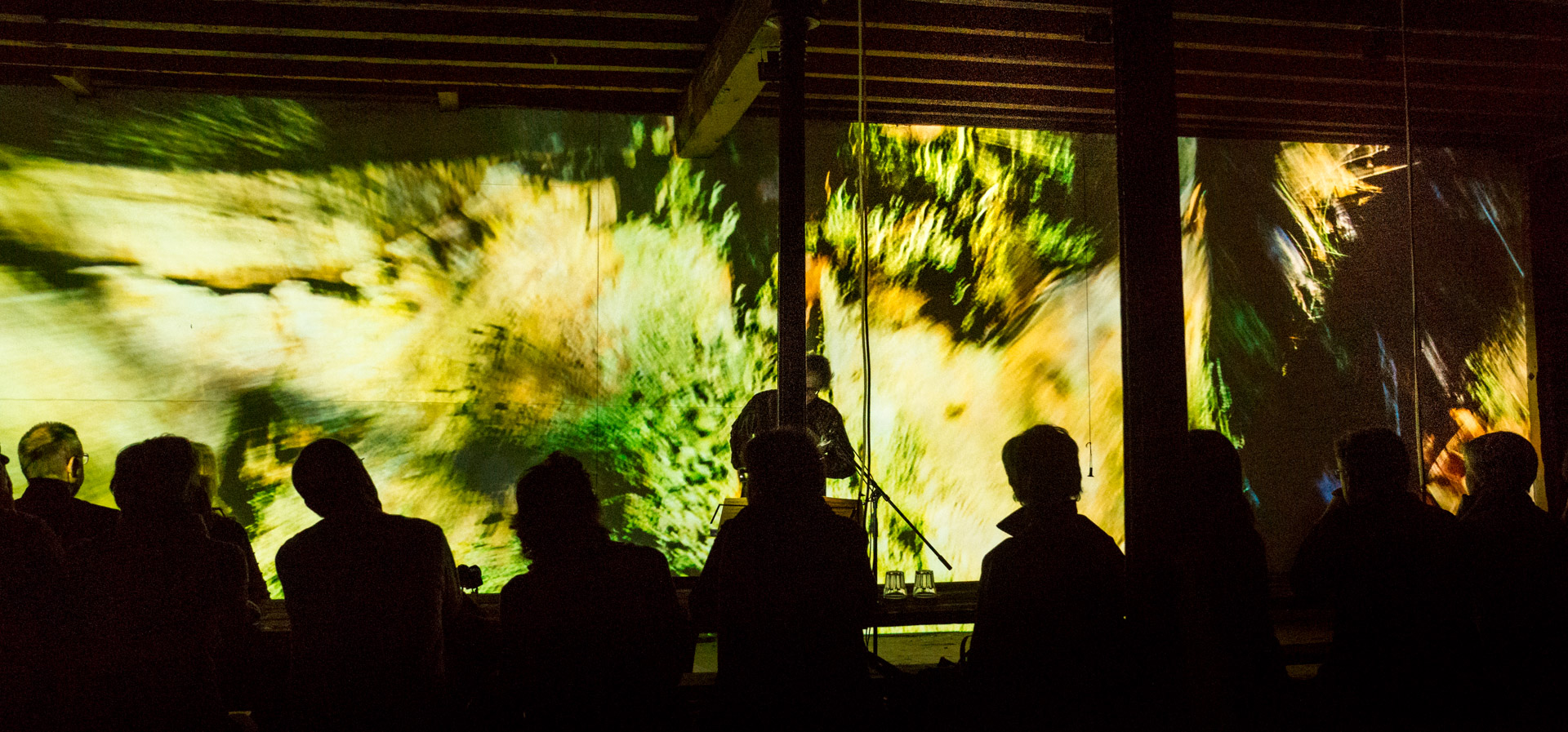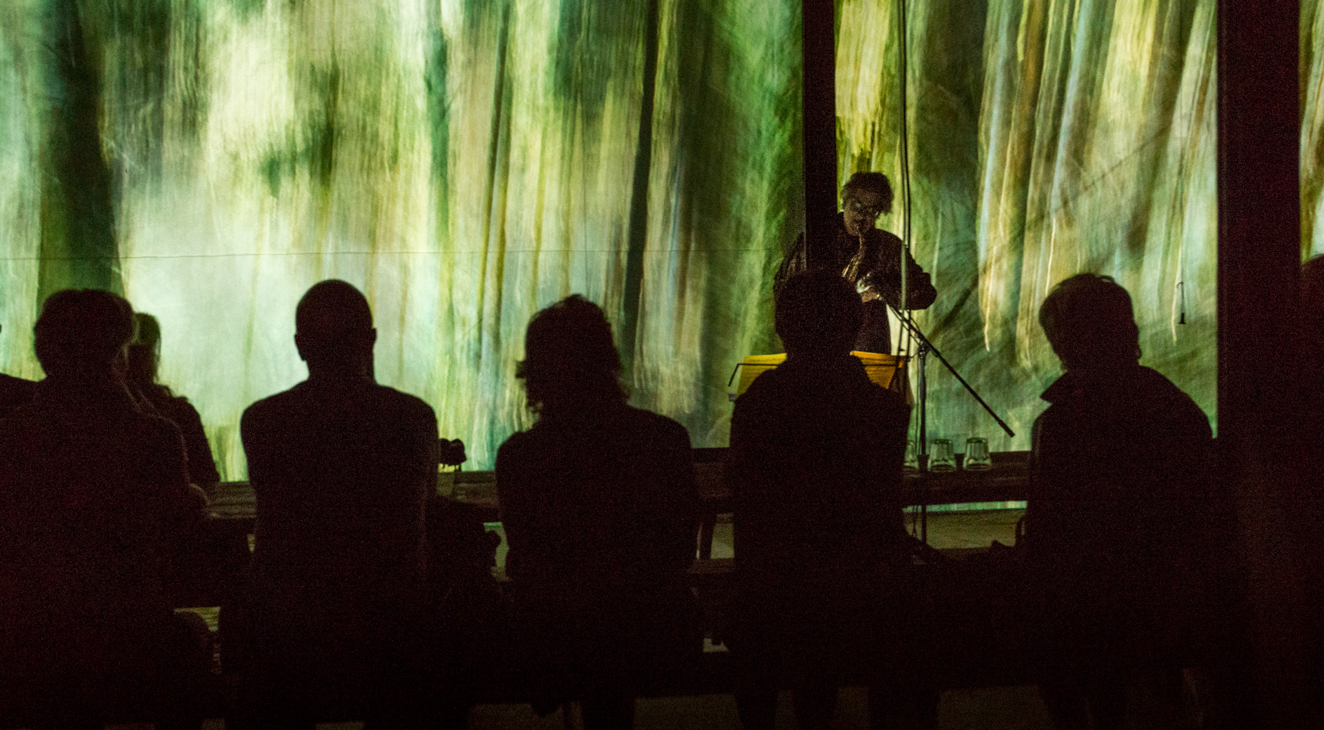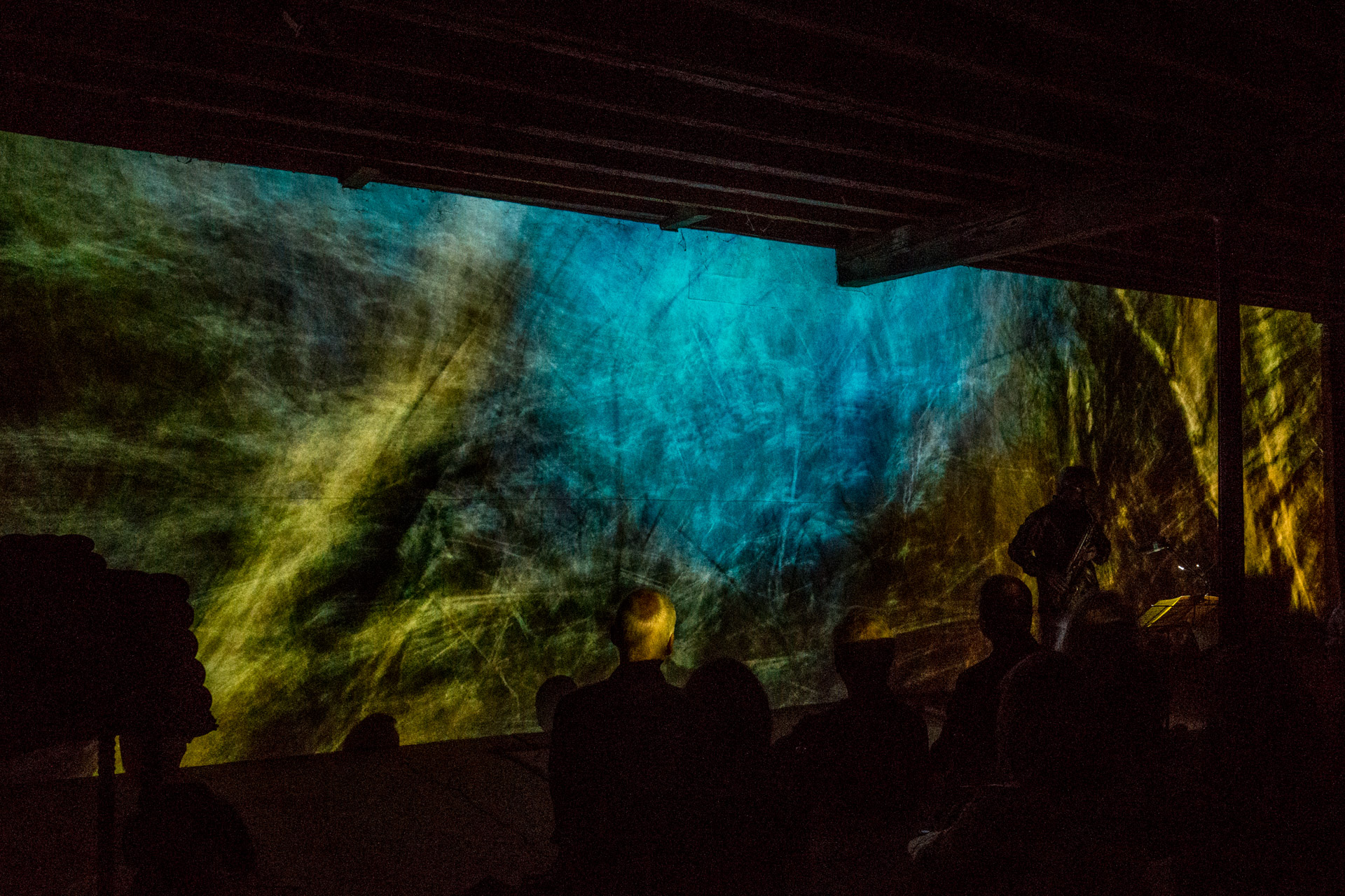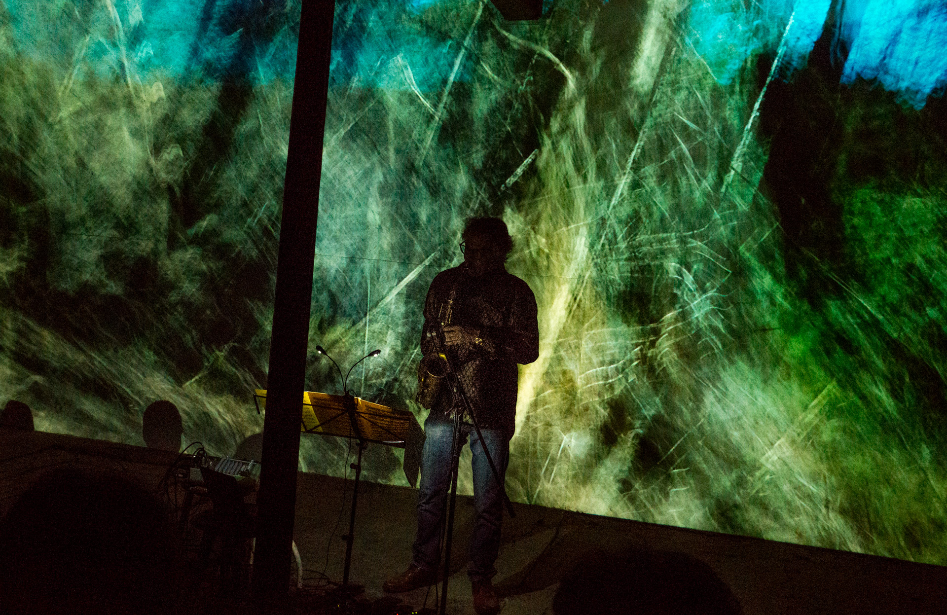 Roger Hanschel spielte seine vierteilige Komposition für Saxofon und Elektronik zu Peter Hölschers vierteiligem Liquid Image »Deutscher Wald«, das formatfüllend auf die 12,5 Meter breite Rückwand seines Ateliers projiziert wurde. Es waren Kompositionen aus Bildern zu sehen, die Hölscher 2017 in deutschen Wäldern aufgenommen hatte.