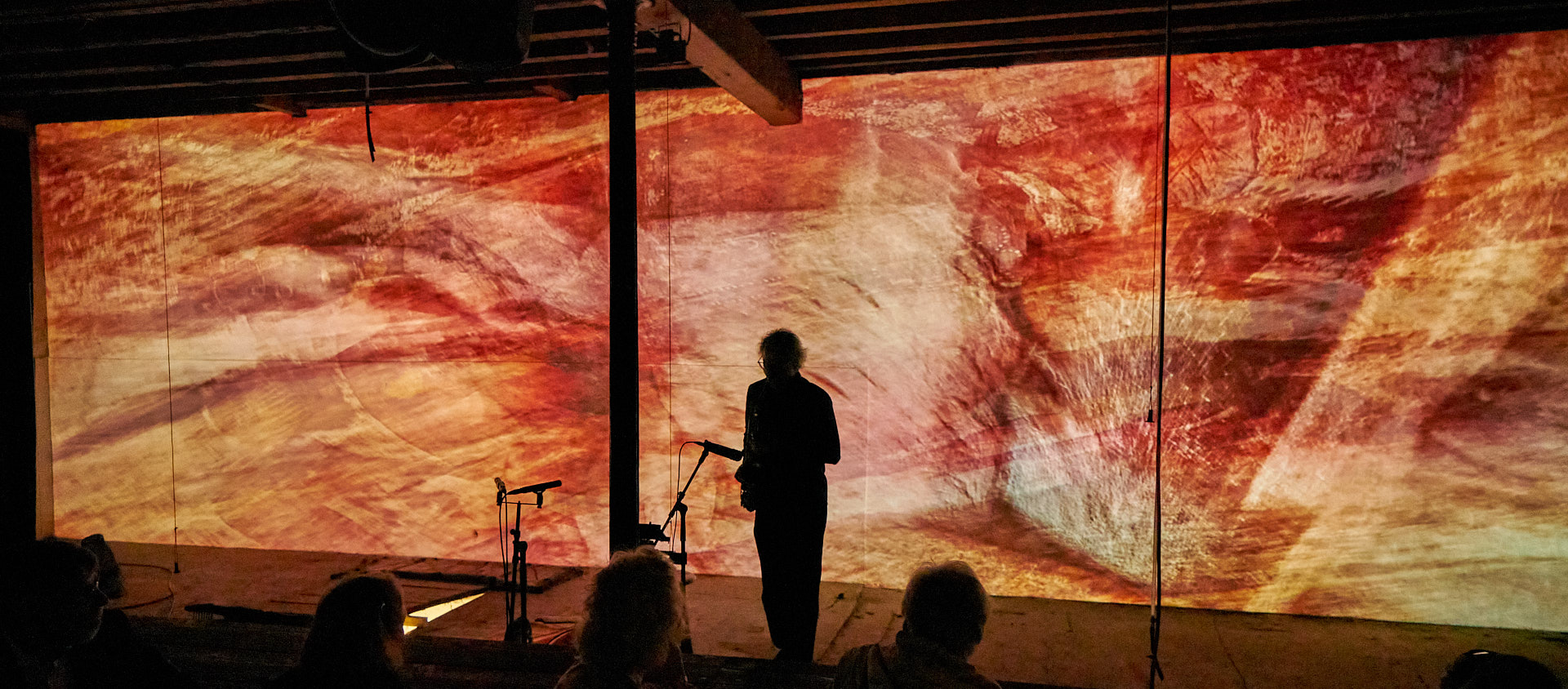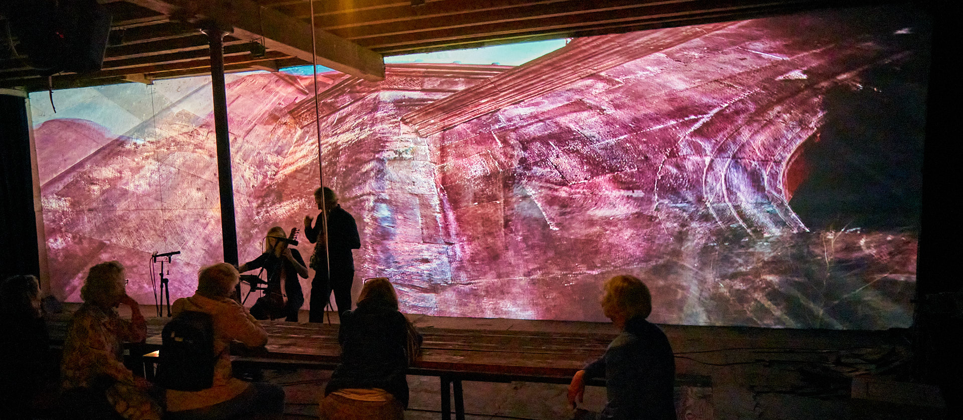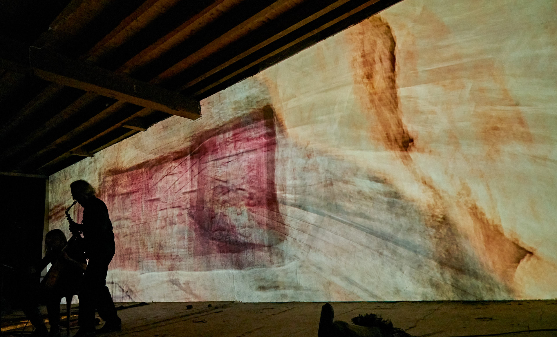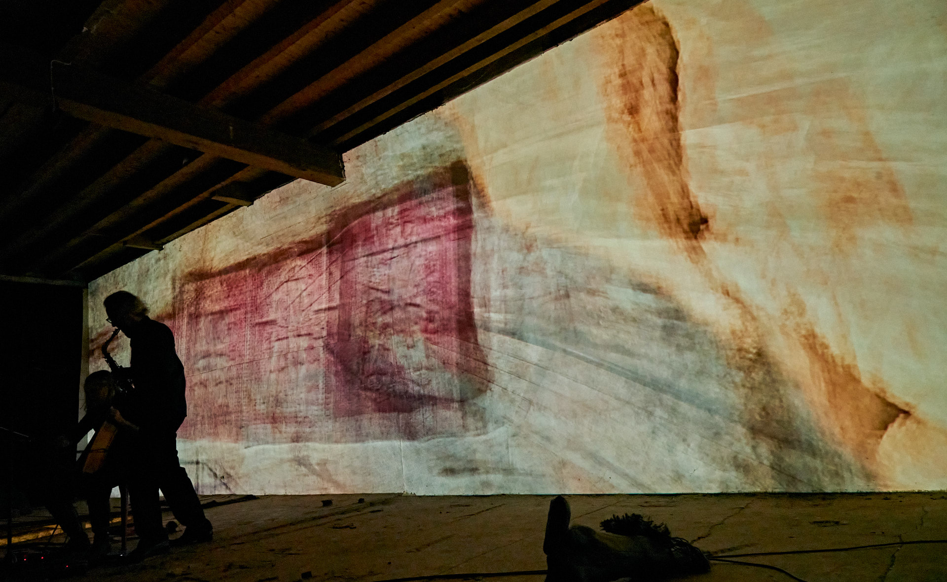 Marei leitete das zweite Mapping eine Etage höher – in meinem Atelier – ein, wo sie zunächst alleine meine neue Klangskulptur »Qi« bespielte, etwas später wieder im Duett mit Roger. Dieses Mapping zeigte dasselbe Liquid Image »Romanesque 1«, wie es zuvor auf Qis Skulptur zu sehen war, aber in 12,5 Meter Breite über die komplette Atelier-Rückwand.