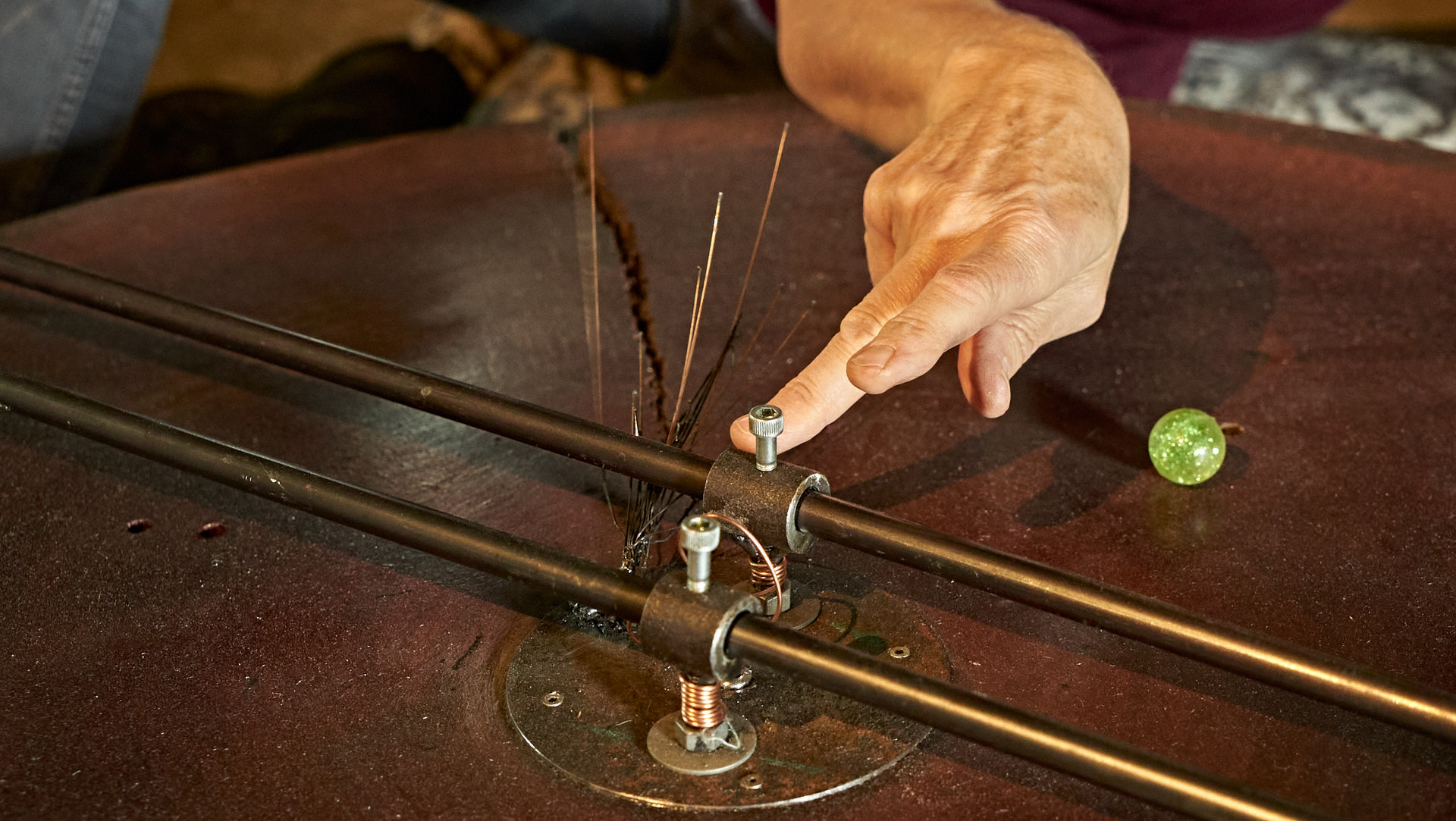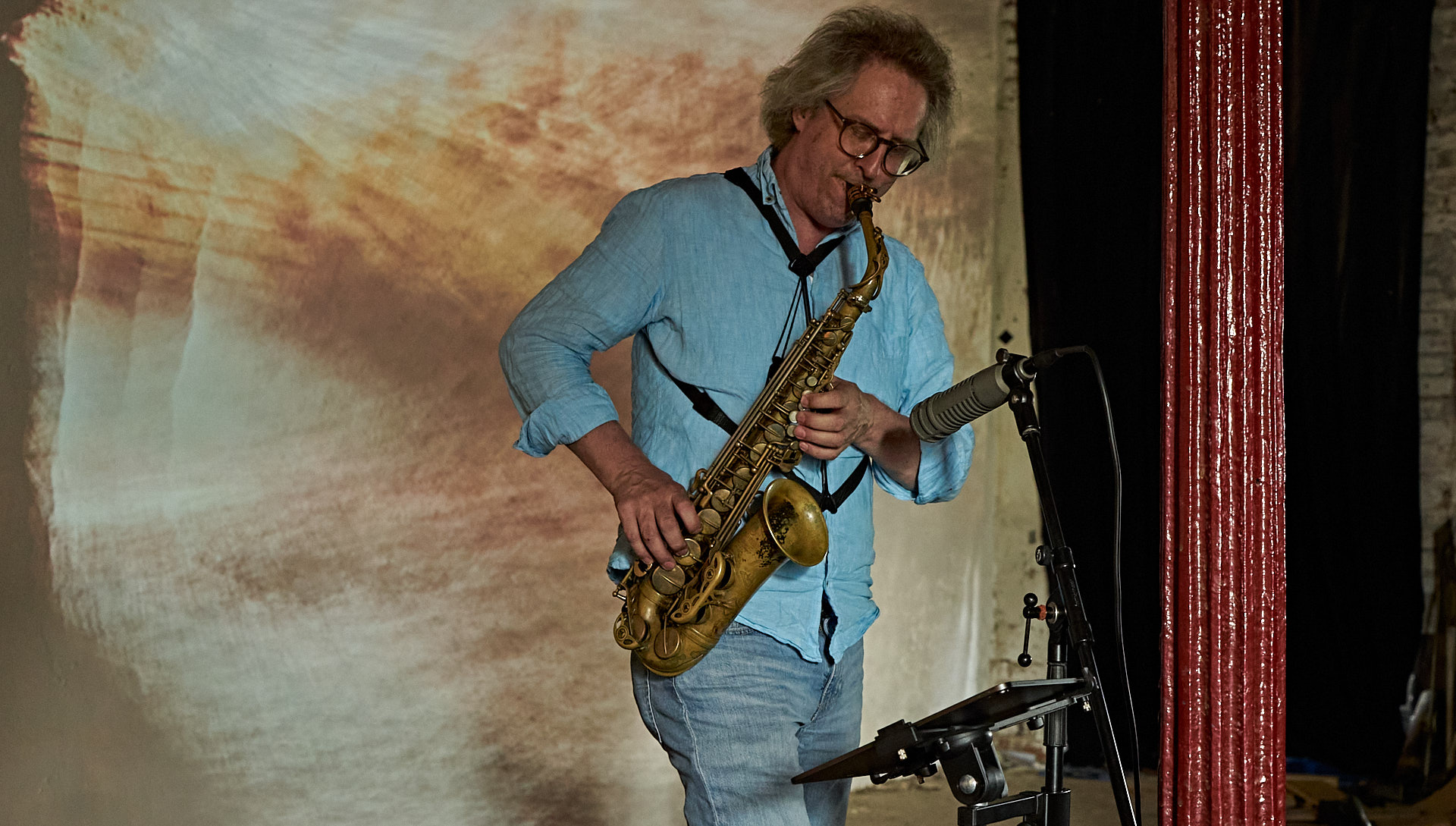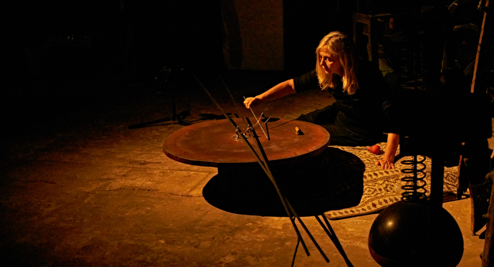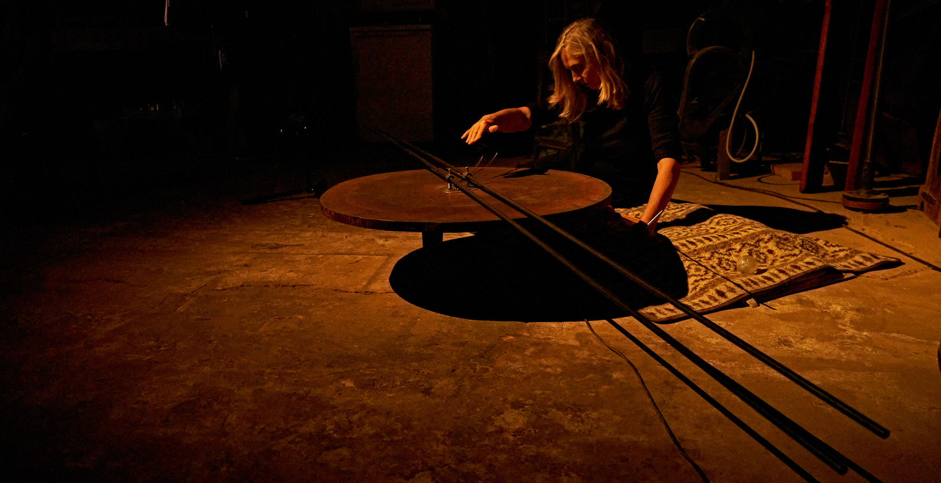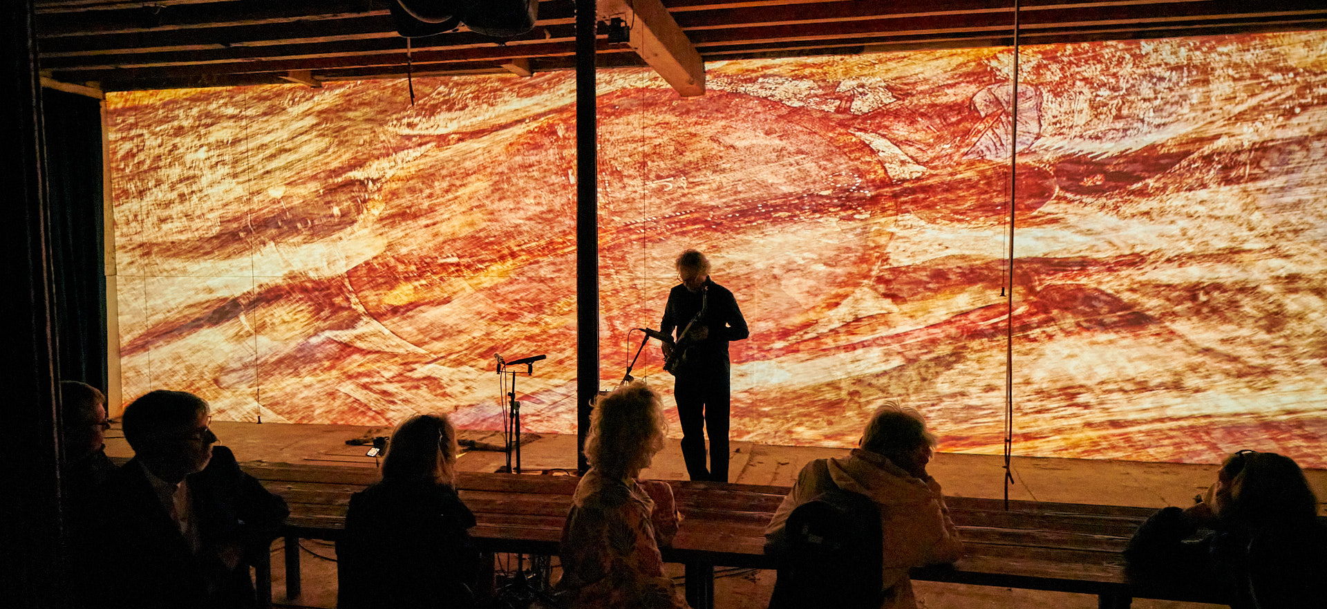Marei leitete das zweite Mapping eine Etage höher – in meinem Atelier – ein, wo sie zunächst alleine meine neue Klangskulptur »Qi« bespielte, etwas später wieder im Duett mit Roger. Dieses Mapping zeigte dasselbe Liquid Image »Romanesque 1«, wie es zuvor auf Qis Skulptur zu sehen war, aber in 12,5 Meter Breite über die komplette Atelier-Rückwand.