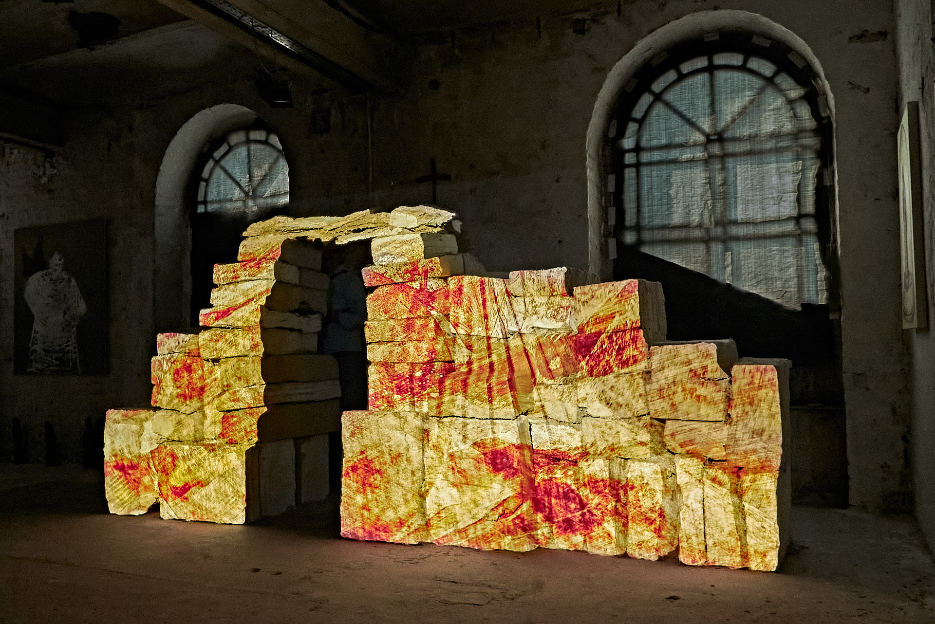 Der Franz war die Basis für meine Kooperation mit Qi, meinem langjährigen Atelier-Nachbarn in der Reuschenberger Mühle. Qi hatte im Sommer 2021 aus schweren Zellstoff-Blöcken einen Tempel gebaut, der nicht nur ihn an Assisi erinnerte. Die Idee, darauf ein Liquid Image zu projizieren, das ich aus Fotos von Romanischen Klöstern in Armenien und Georgien komponiert hatte, war zwingend.