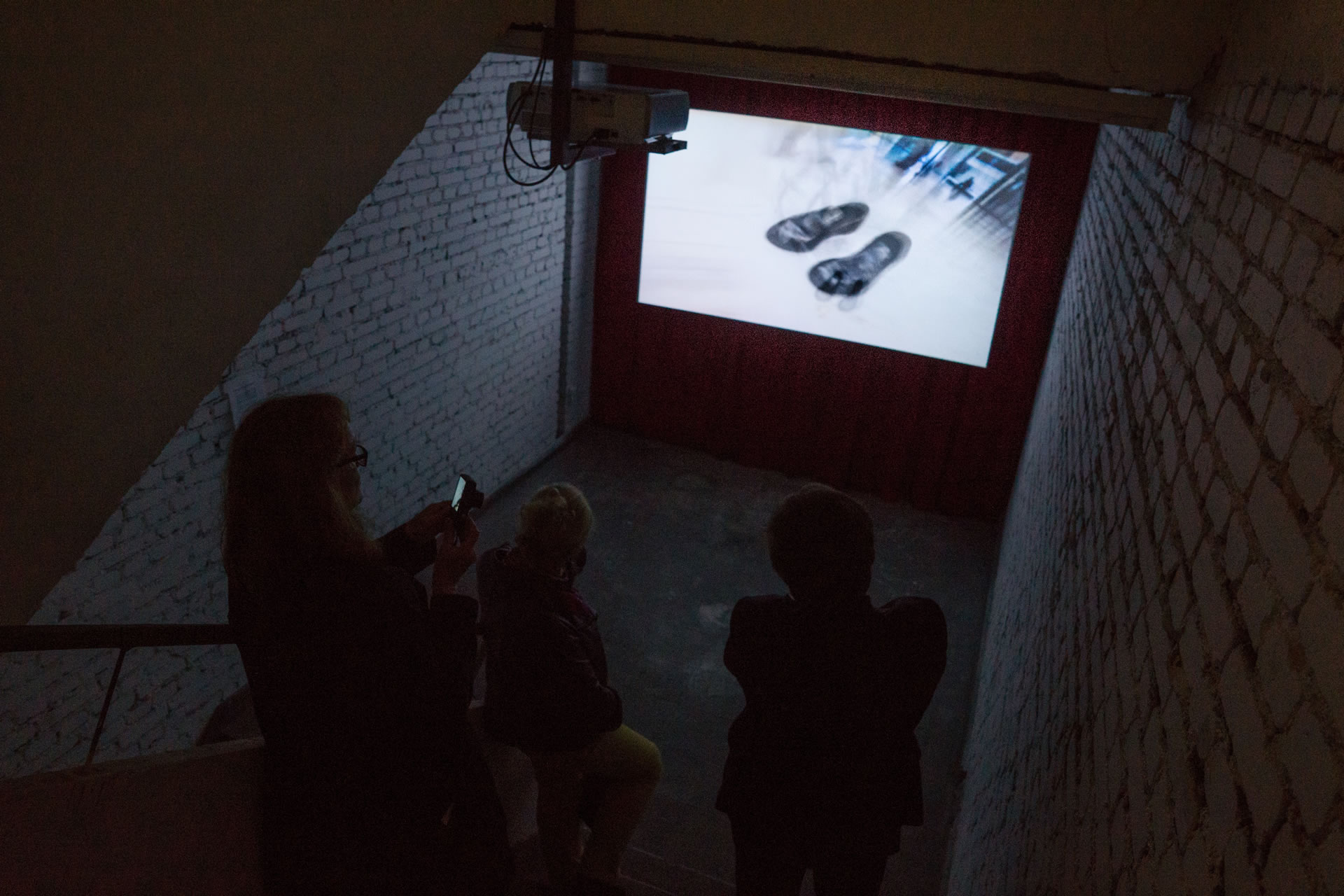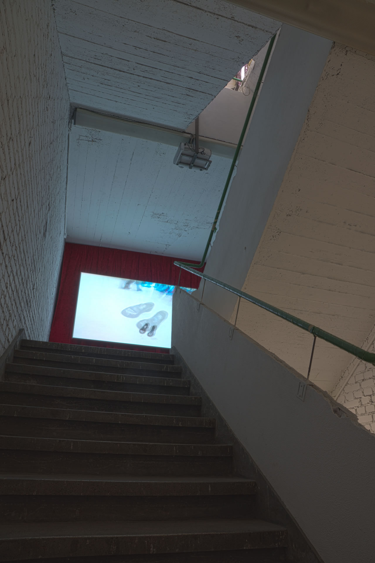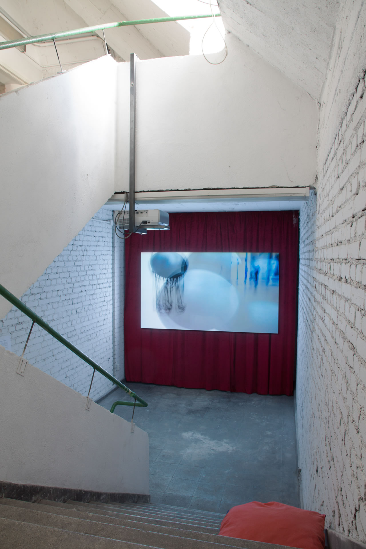 Wir haben im Treppenhaus eine Installation aufgebaut, die an einen Kinosaal erinnert, nur eben nicht im Kino, sondern im Treppenhaus der Betonbox. Durch den teilweise recht prägnanten Sound wurde diese Inastallation schon am Eingang 2 Etagen tiefer angekündigt. Die Installation selbst lud zur Betrachtung ein; auf den Treppen lagen Kissen.