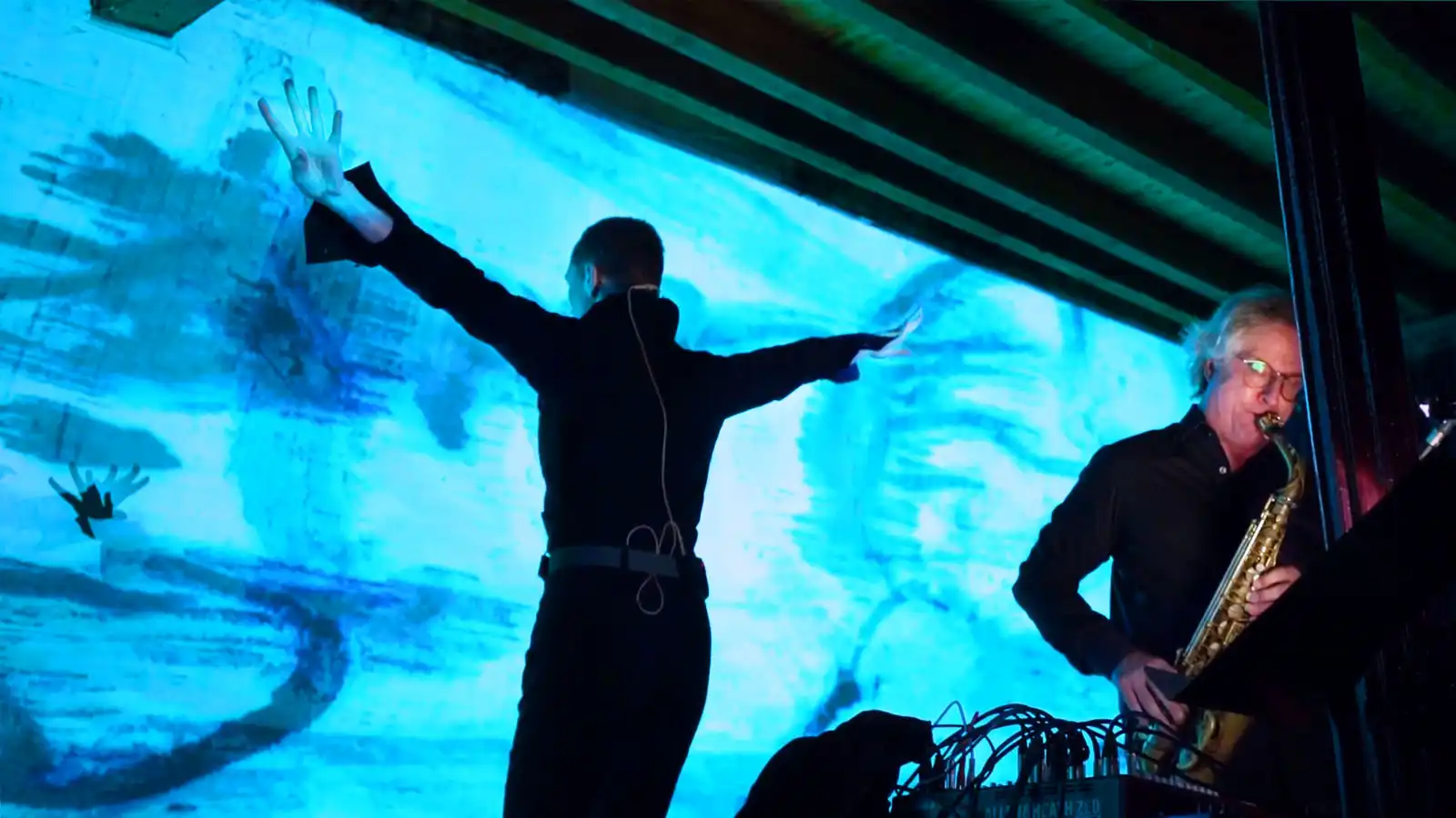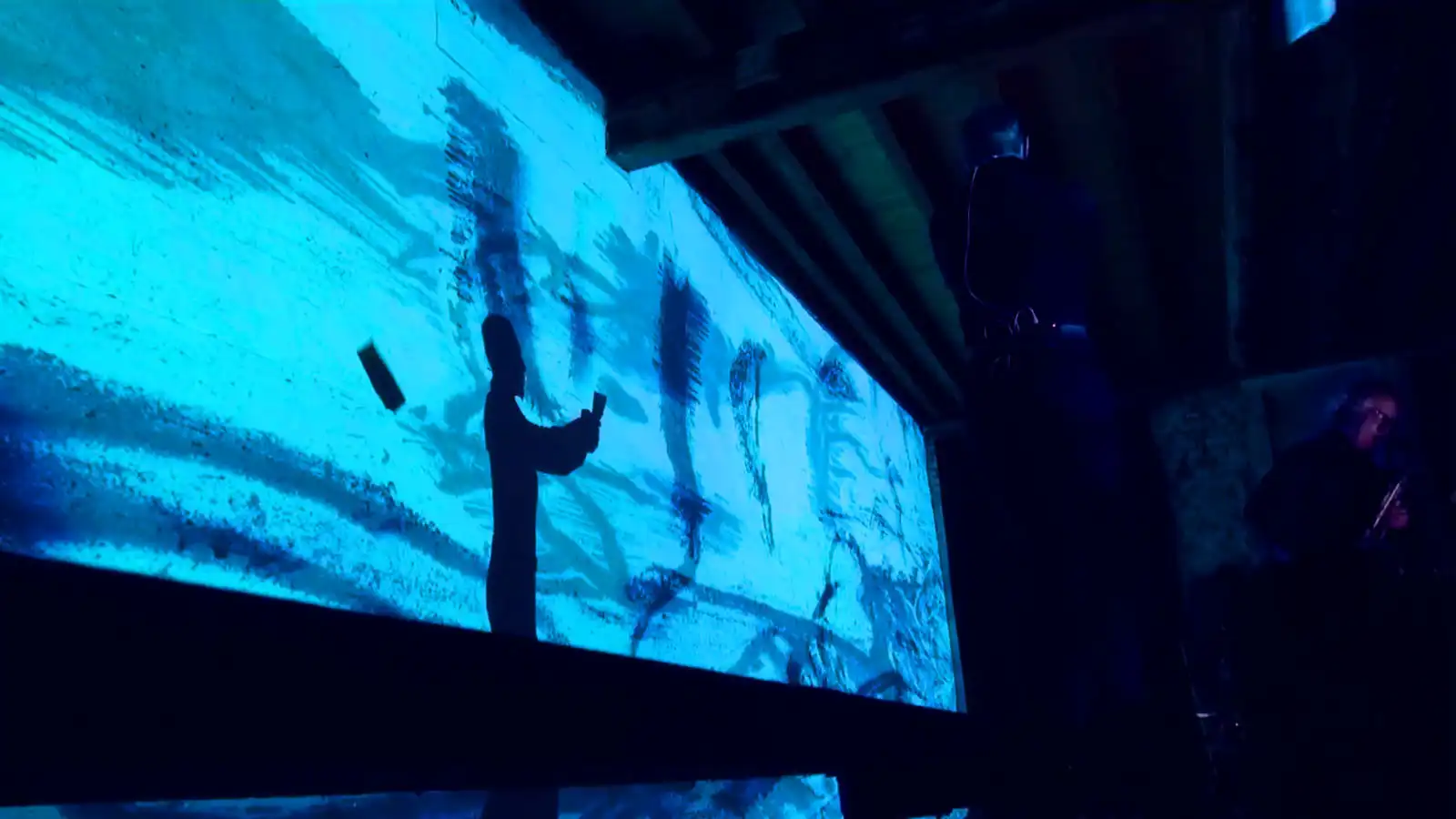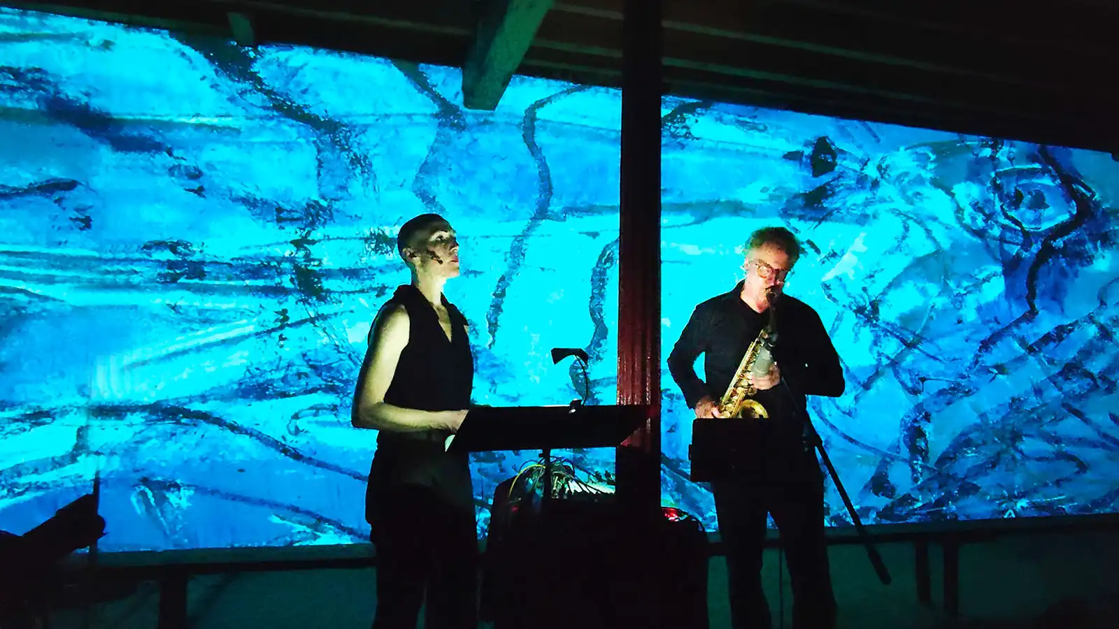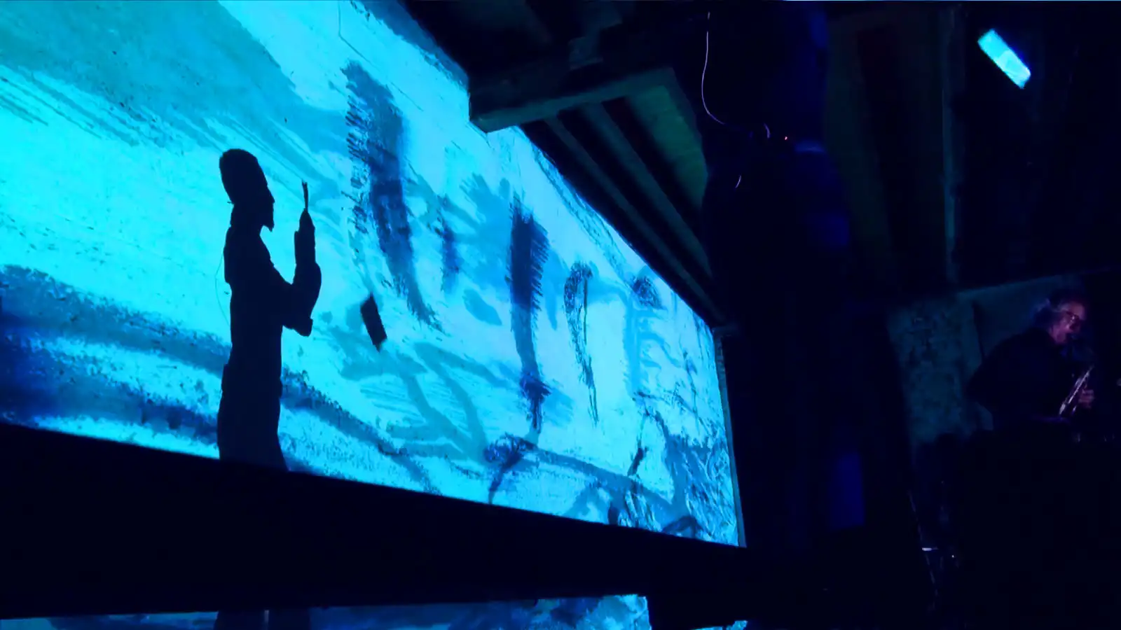 L’Origine, das sind Malereien, die in einem Liquid Image zusammenfließen. Wörter, die sich zu einem metaphysischen Text verbinden. Saxophonklänge, die auf Bild und Text balancieren. Schließlich der Mensch – Stimme, Bewegung, Atem – der alles vereint.