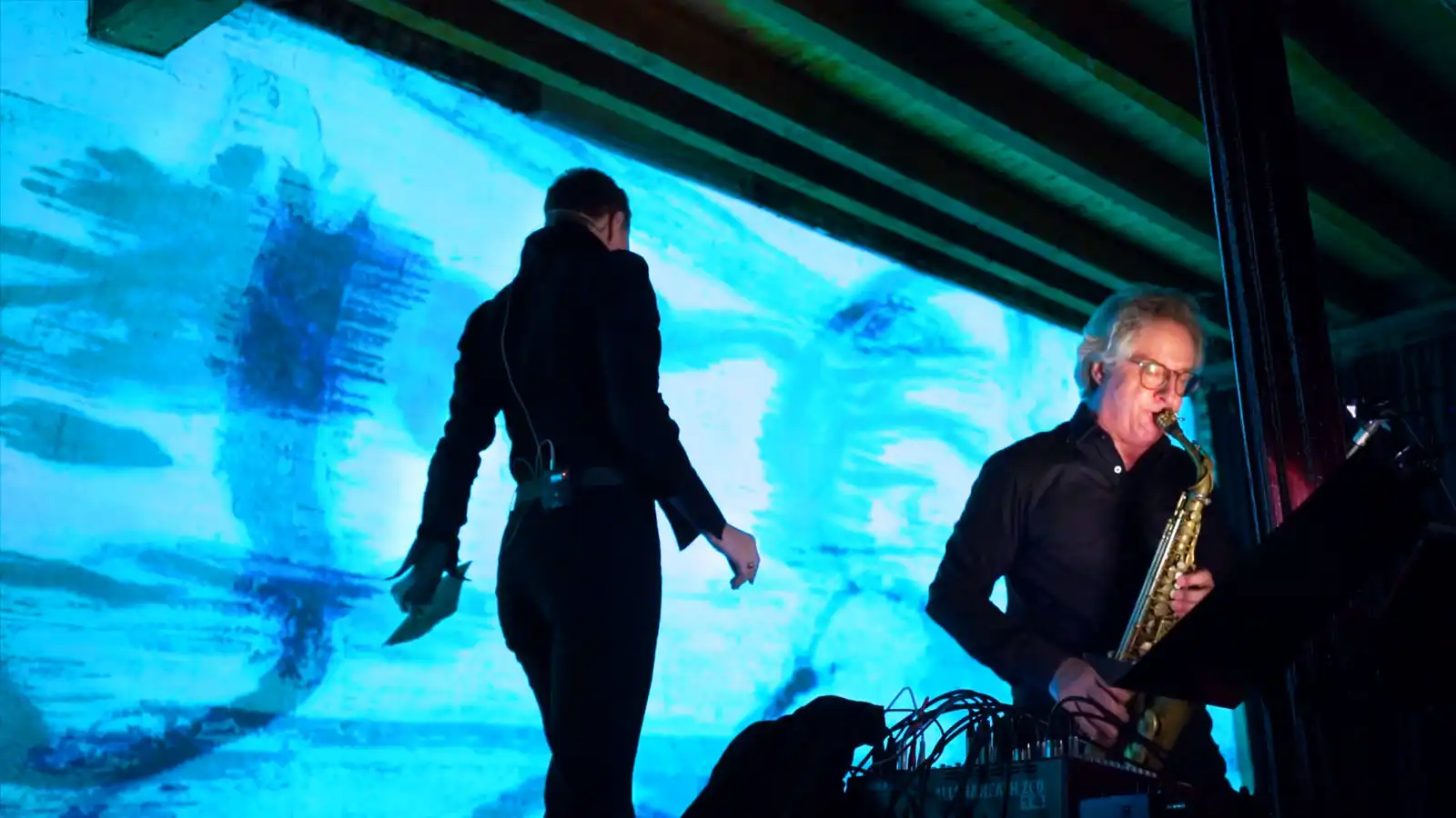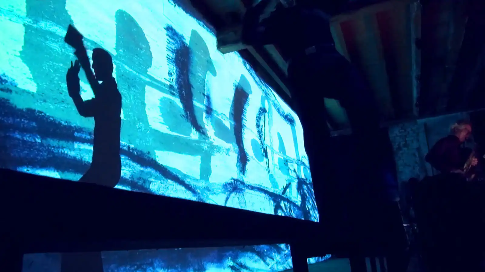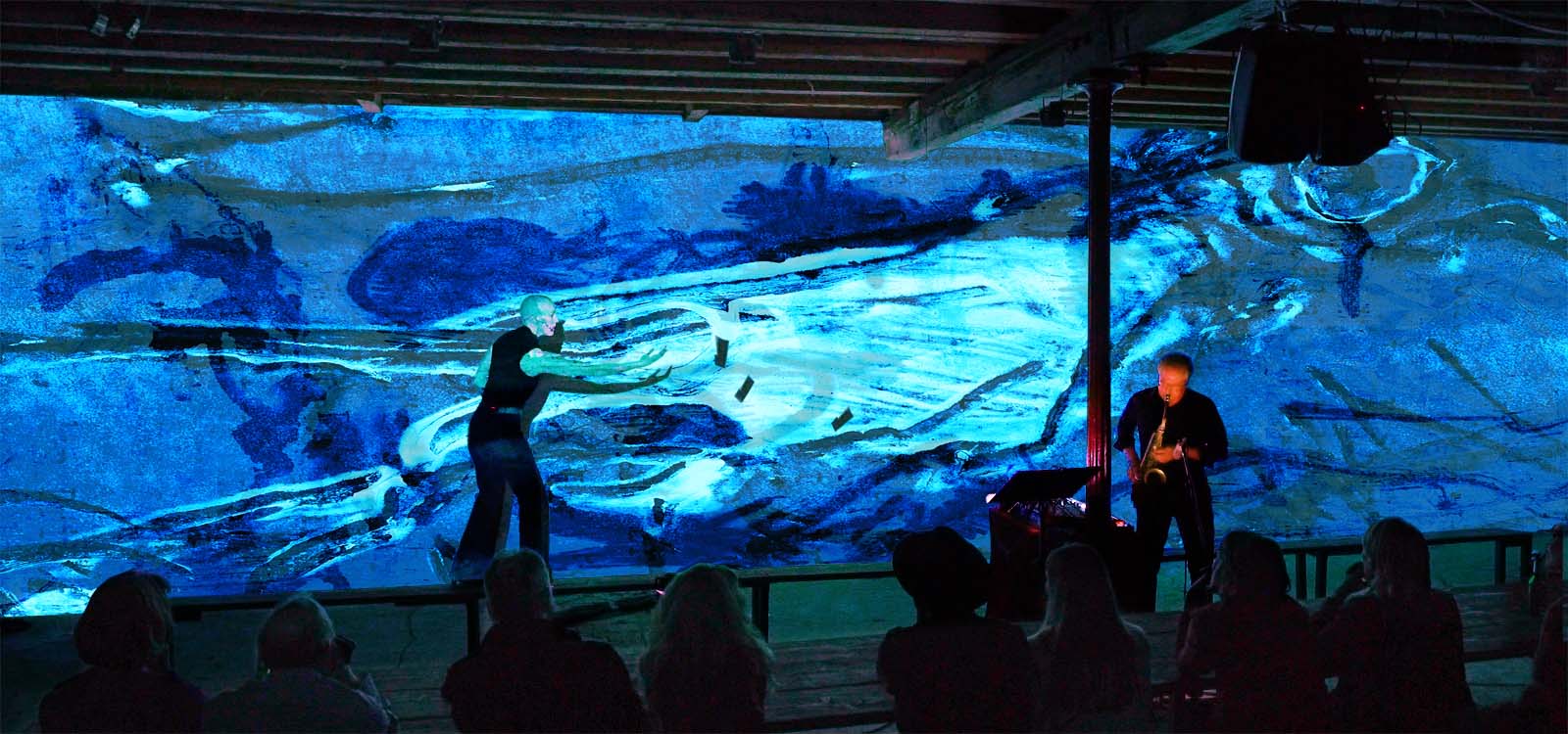 L’Origine, das sind Malereien, die in einem Liquid Image zusammenfließen. Wörter, die sich zu einem metaphysischen Text verbinden. Saxophonklänge, die auf Bild und Text balancieren. Schließlich der Mensch – Stimme, Bewegung, Atem – der alles vereint.