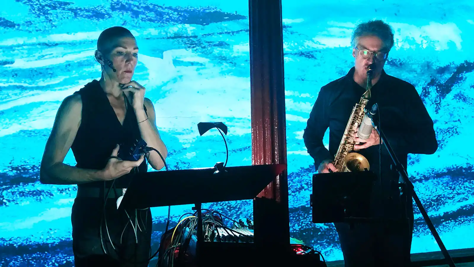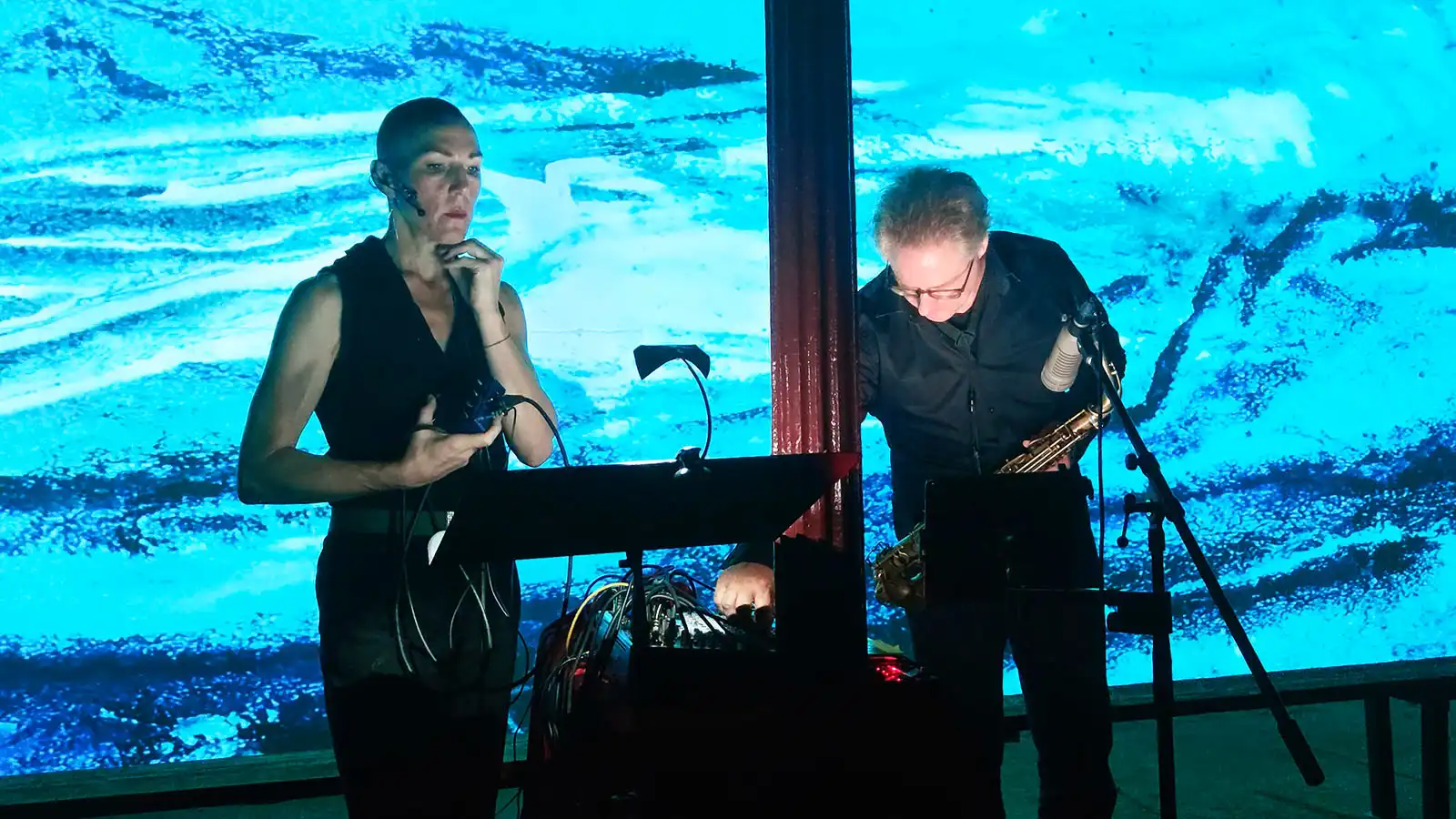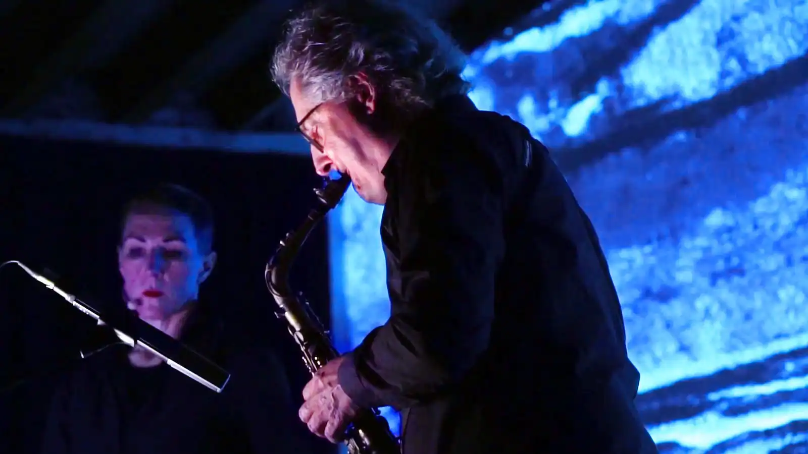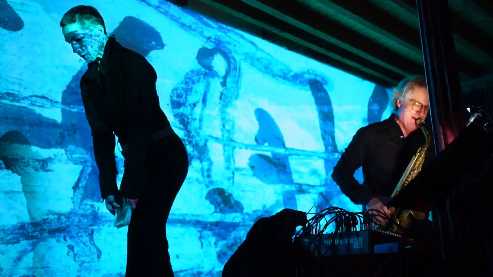 L’Origine, das sind Malereien, die in einem Liquid Image zusammenfließen. Wörter, die sich zu einem metaphysischen Text verbinden. Saxophonklänge, die auf Bild und Text balancieren. Schließlich der Mensch – Stimme, Bewegung, Atem – der alles vereint.